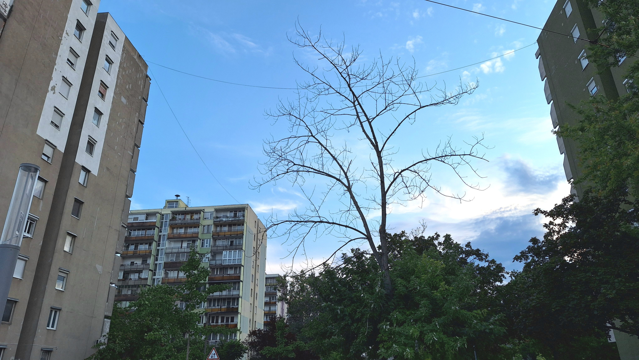 A Bíró Mihály utcai kutyafuttatóban az egyik fa felső kétharmada elszáradt, ezt a balesetveszély elkerülése érdekében érdemes lenne visszavágni.