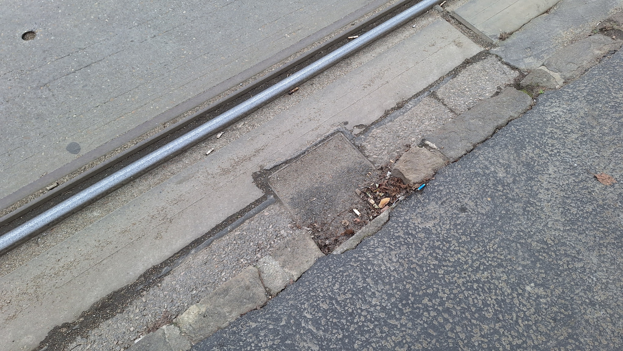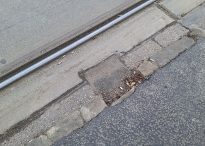 A Török Flóris utca 70. előtti megálló táblájánál van egy régi, eltömődött víznyelő, a rácsa is hiányzik.