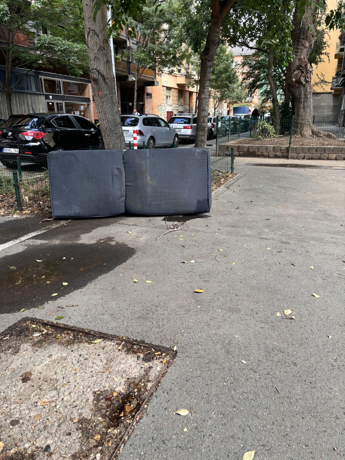 Egy komplett ágyat dobtak ki mai napon a délelőtt folyamán valószínűleg. Helyszin: biztosító parkolója előtti járda, fák mellett: Kresz Géza 47-49. előtt.