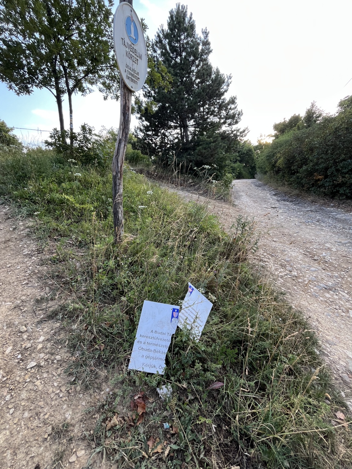 Összetörve hever az óbudai önkormányzat behajtás határát jelző táblája a Virágosnyeregben a Tájvédelmi körzet szélén.