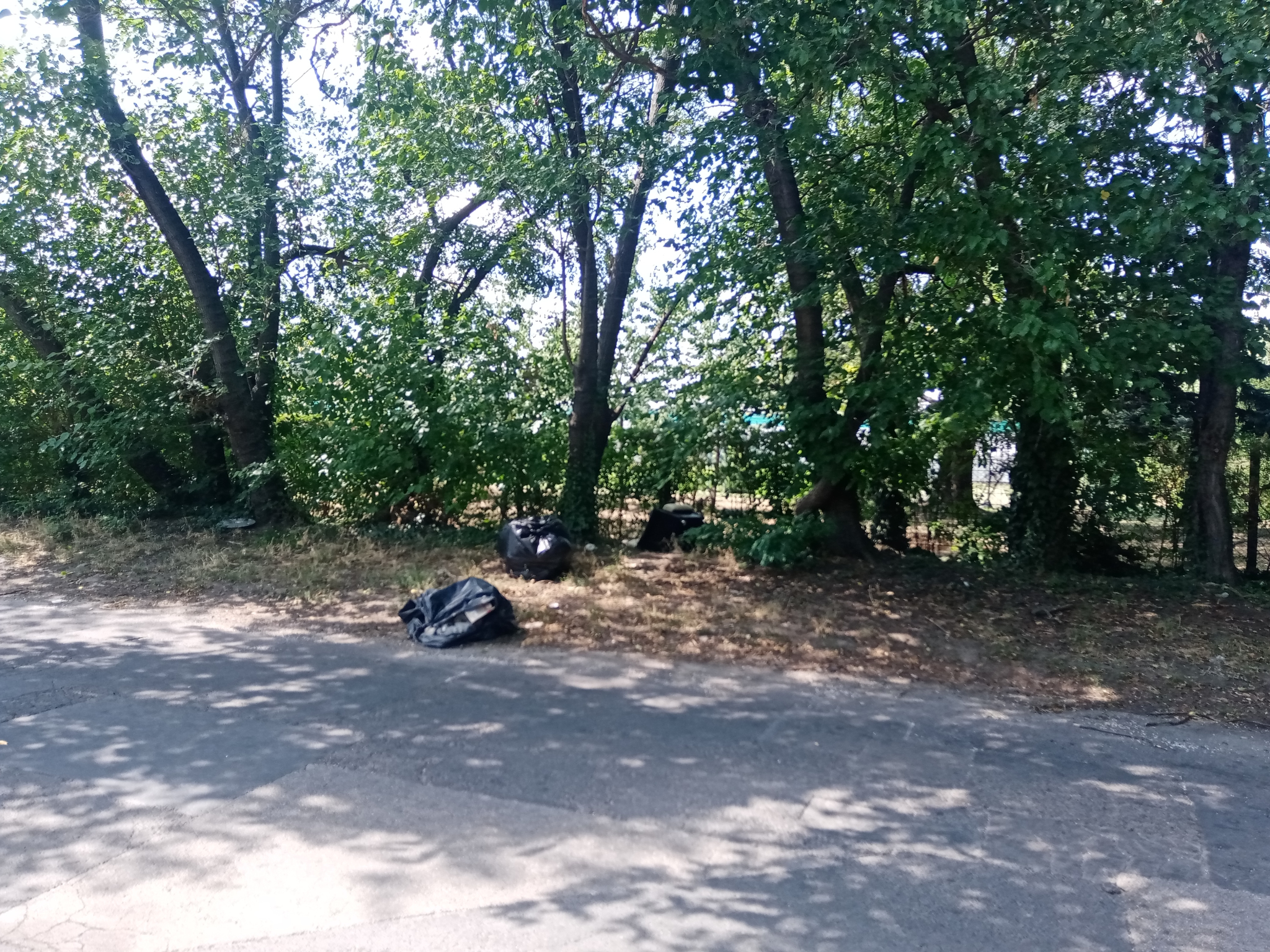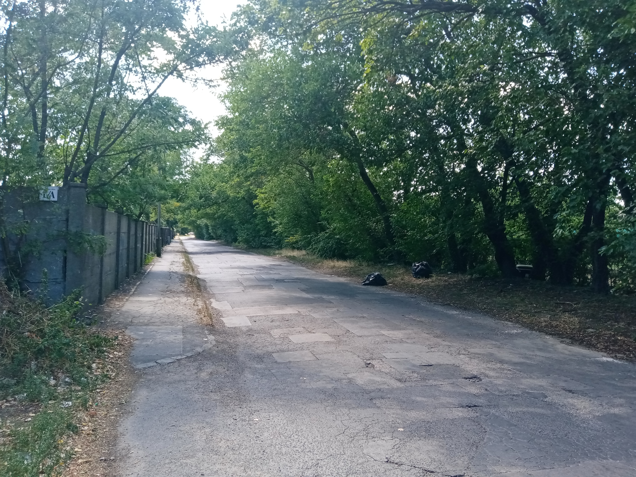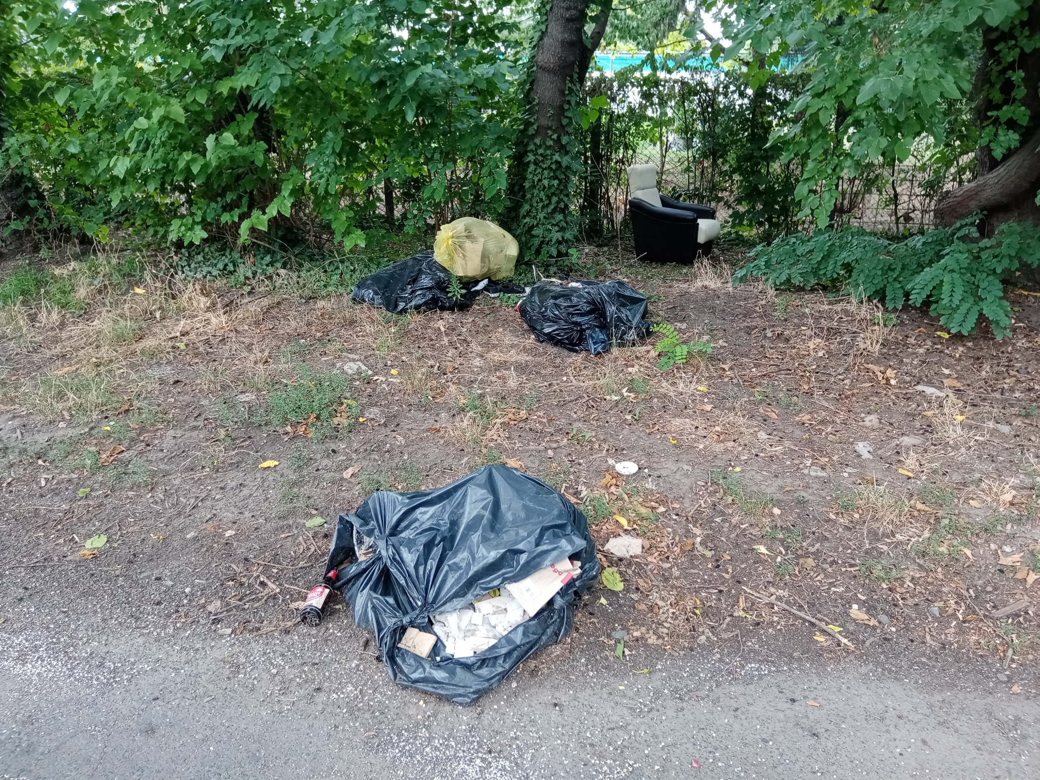 Az Algyógyi utca kb. felénél az úttestre is lelógó hulladékkal teli zsák, körülötte egyéb hulladék.