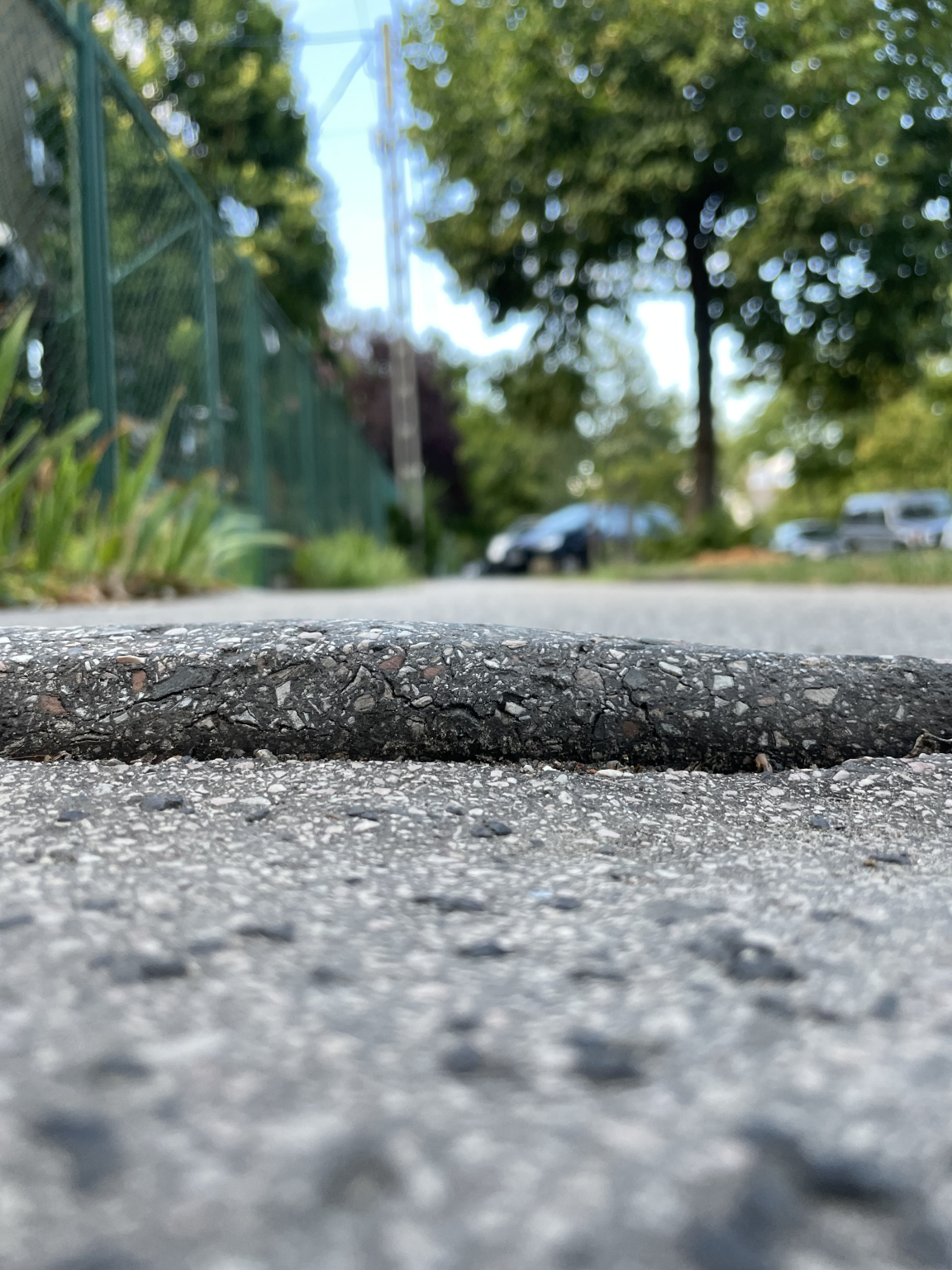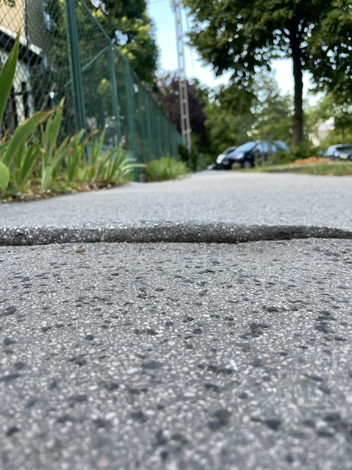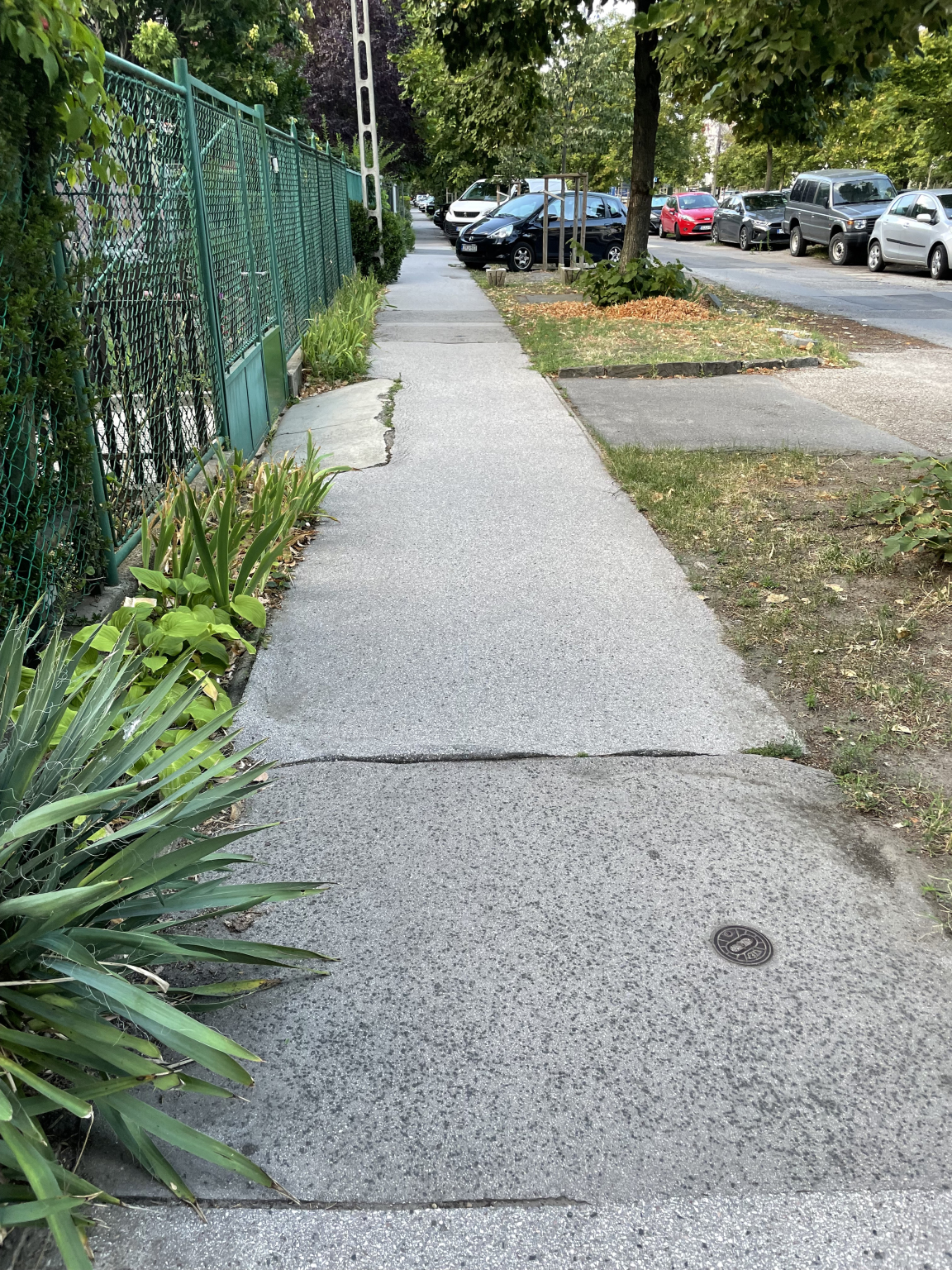 A járda ezen szakaszán 1-5cm-es magasságú kitüremkedések vannak, balesetveszélyesek.