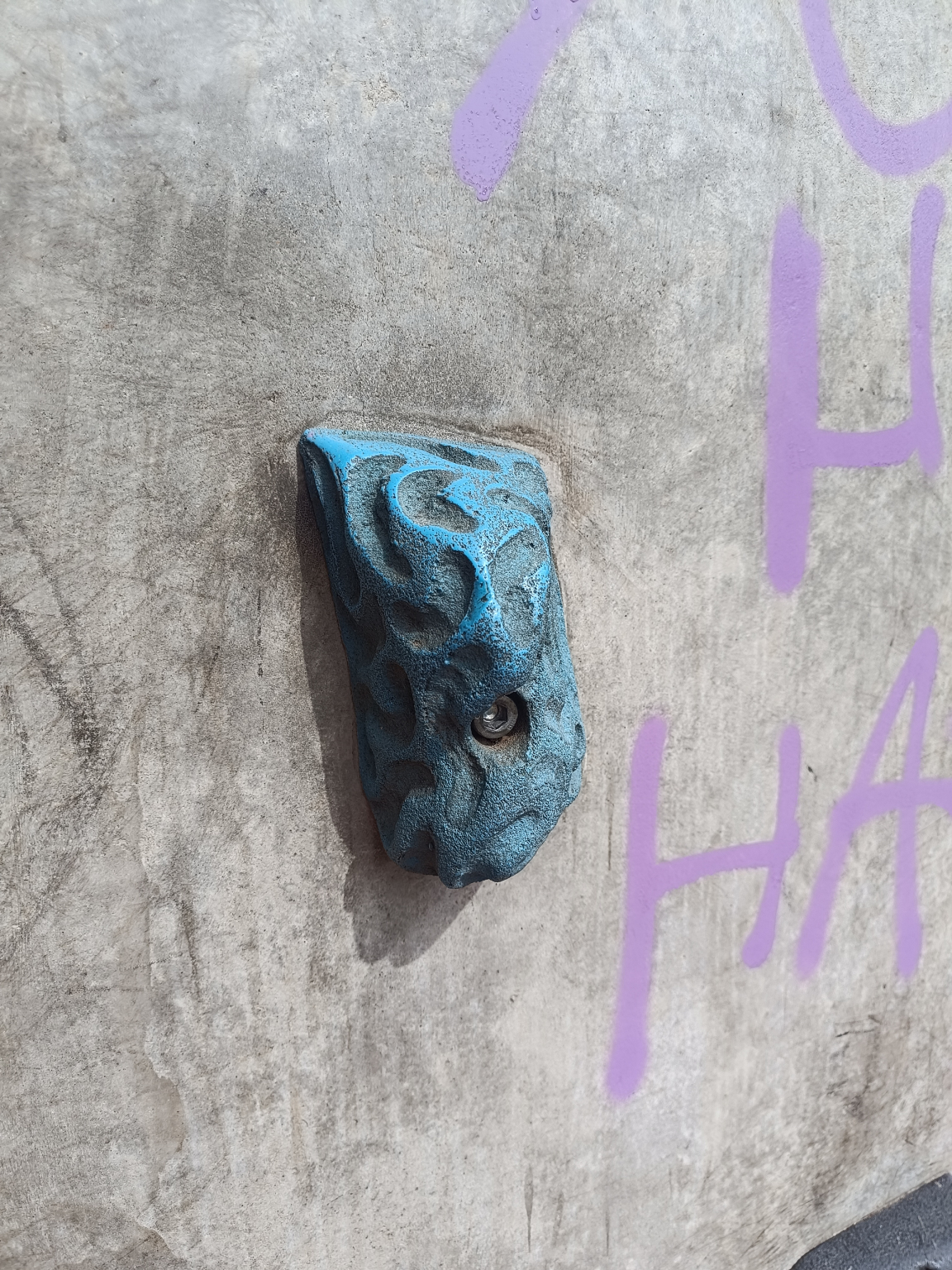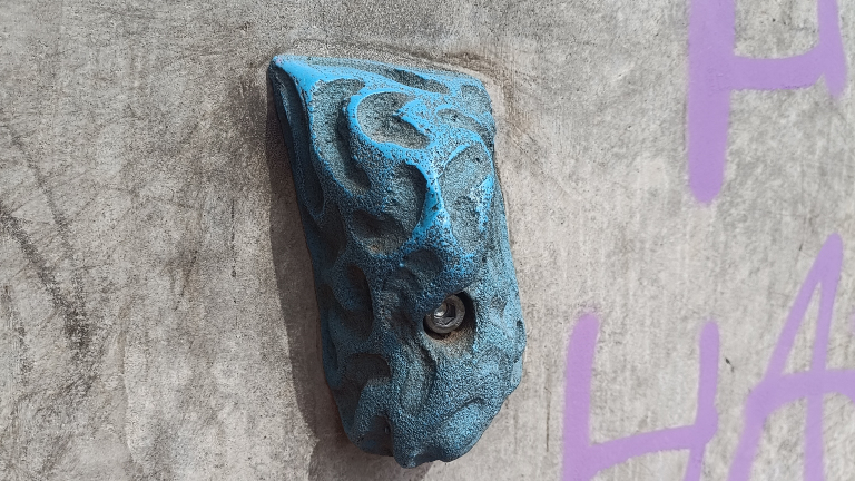 A Városligetben lévő mászófalon erősen lötyög egy kék fogás.