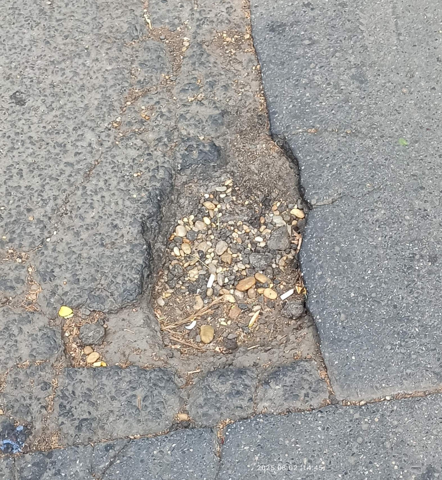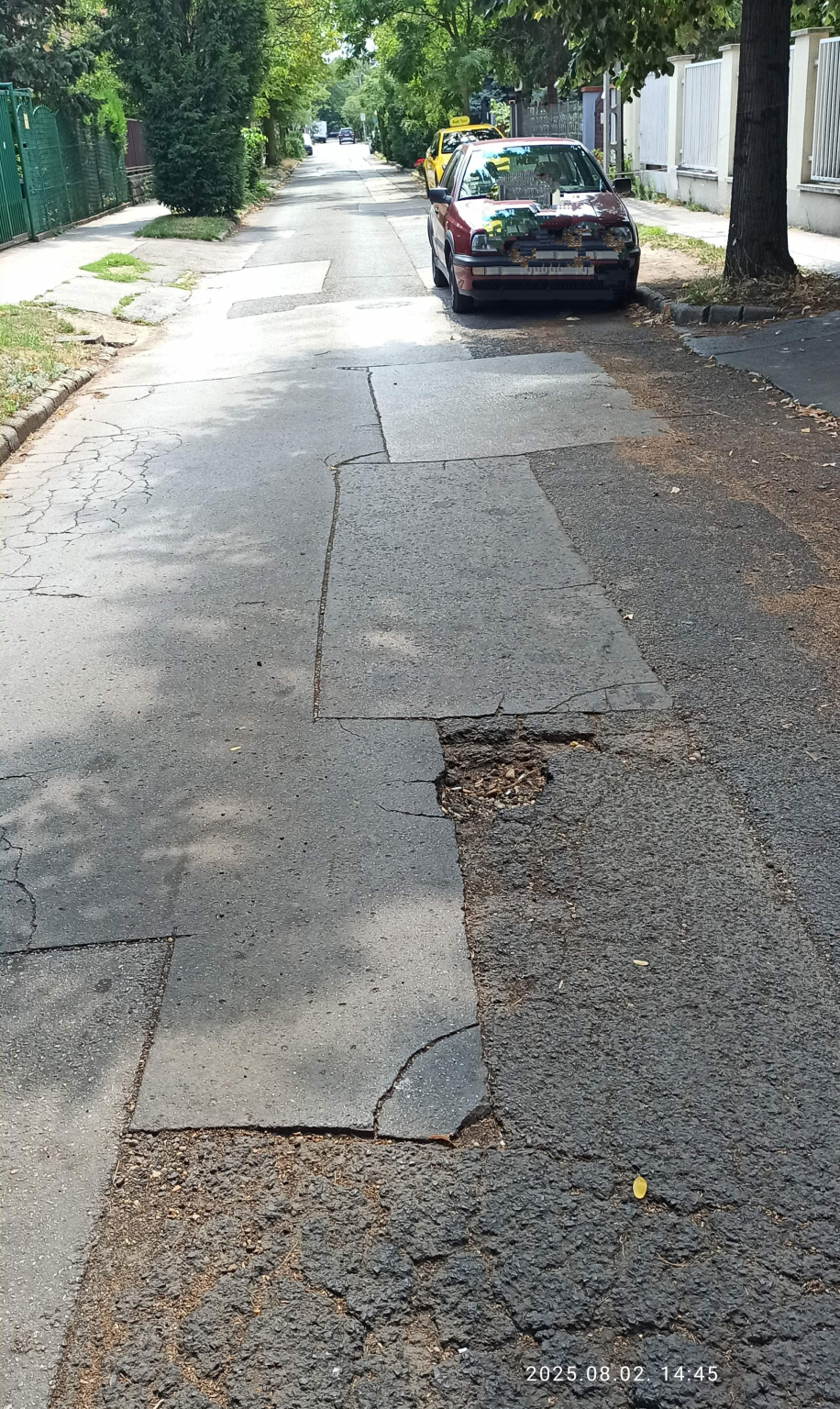 Viszonylag mélyebb,így veszélyes kátyú. Már korábban jelentettem de valami nem sikerült mert eltűnt.