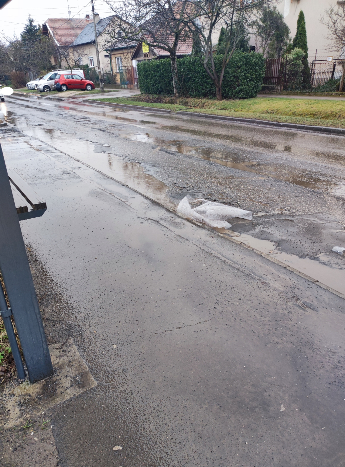 A fotók a 18.kerületi Gyékény téri buszmegállót (irány KÖKI felé) mutatja, ahol a megálló előtti útszakasz nagymértékben megsüllyedt, ezért esőben nagy mennyiségű, mélységű víz áll meg a kátyúkban, emiatt a belváros felé haladó autók felcsapják a vizet a megállóban várakozó utasokra. Igazság szerint esőben mindenki a buszmegálló mögött várakozik, hogy elkerülje a felcsapó víz, sár okozta károkat vagyis a fedett buszmegálló éppen a rendeltetését nem tudja ellátni.Köszönöm!Makra Zoltán
