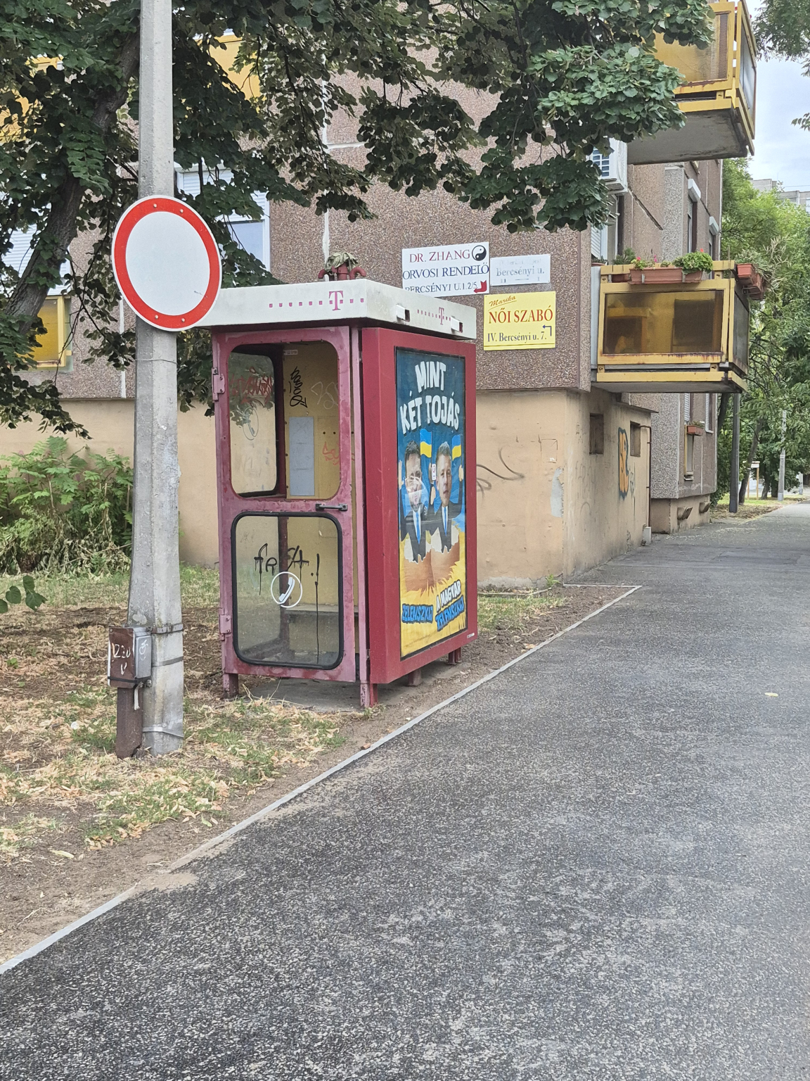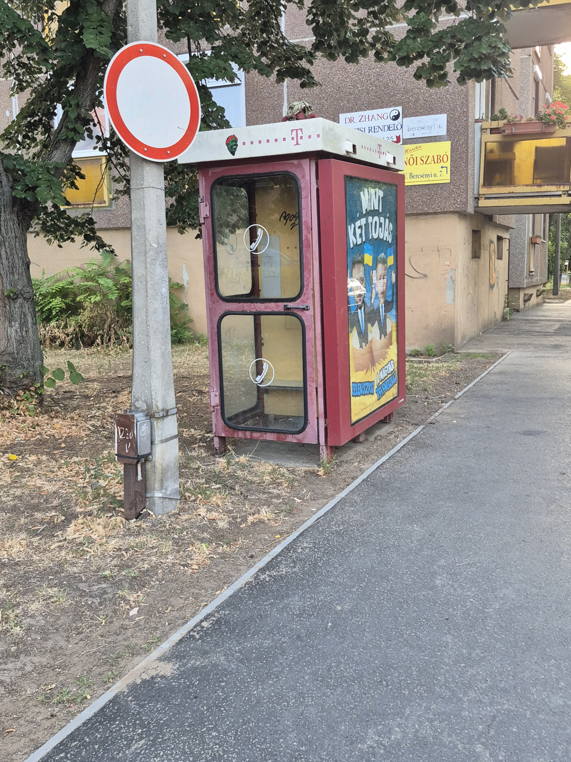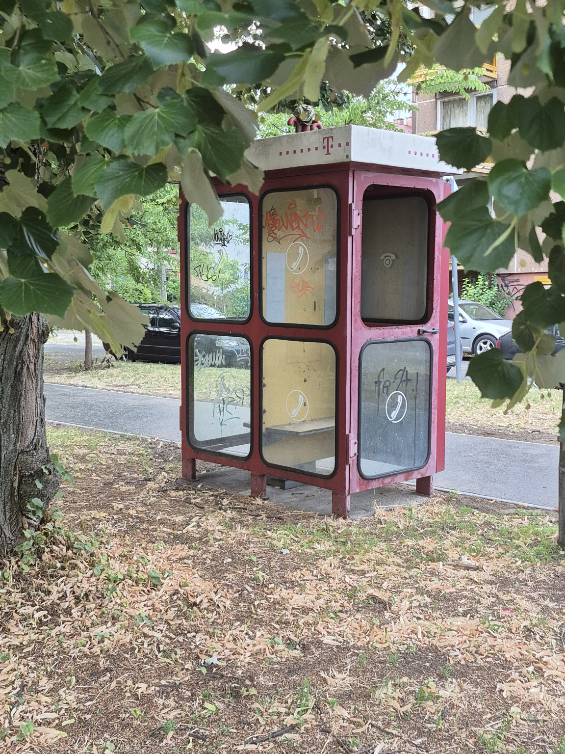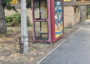 A telefonfülke egyik ablaka hiányzik és sok graffiti rajta.