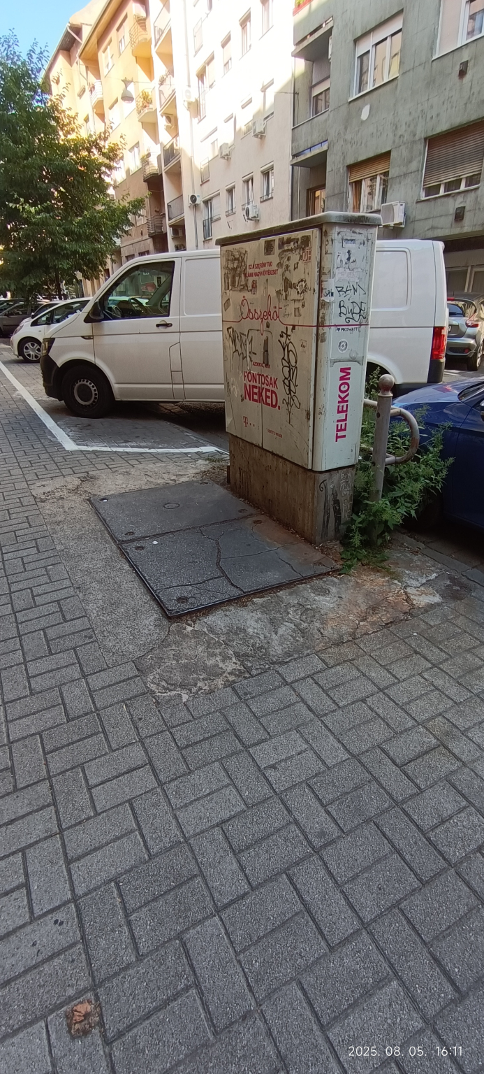 Elképesztő állapotban lévő graffitis szekrény amit felver a gaz, az előtte lévő fedlapok és azok kávái egyáltalán nincsenek járdaszintben, kérem állítsák helyre, egyáltalán nem méltó a Telekomhoz.