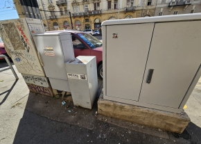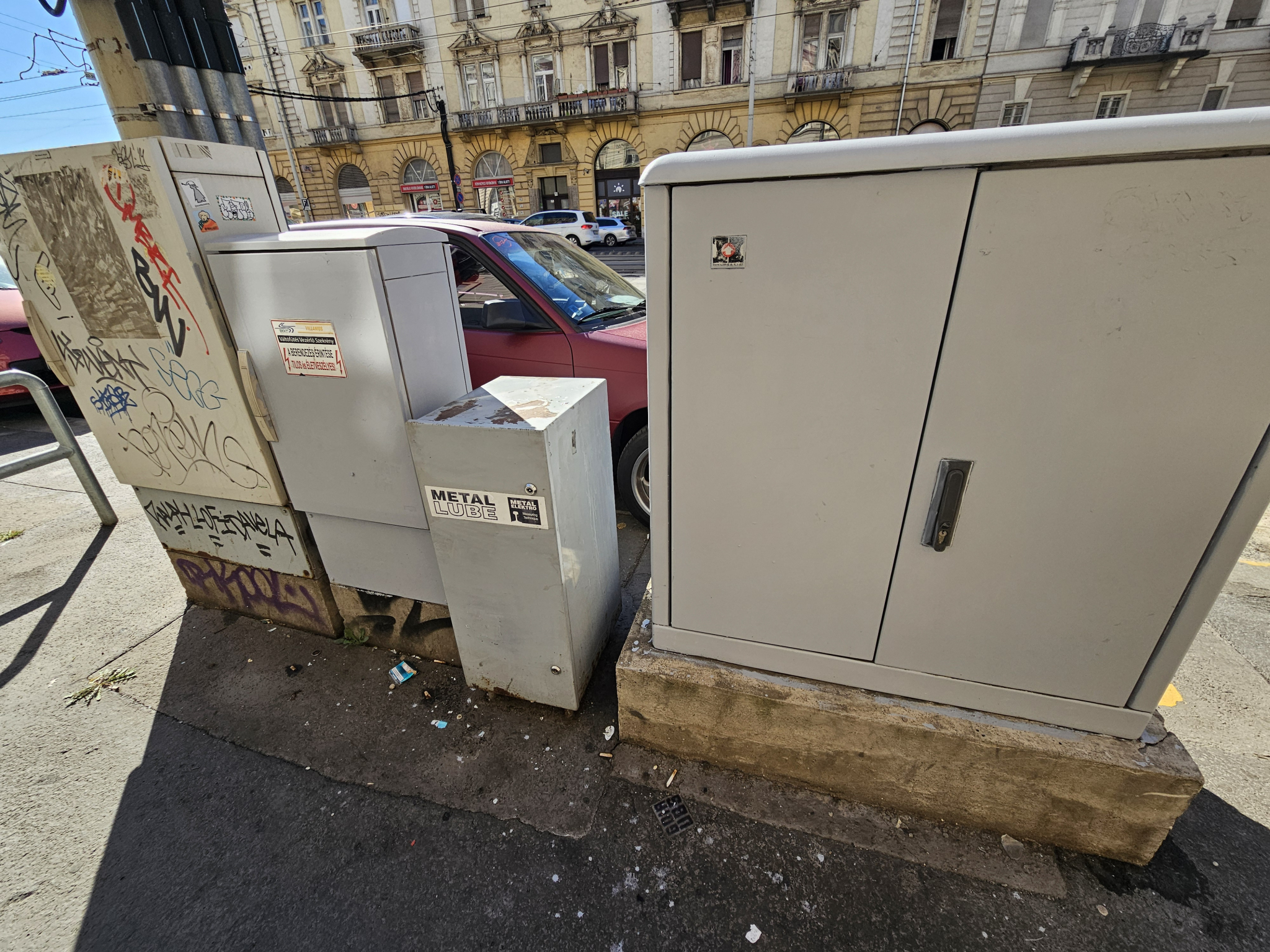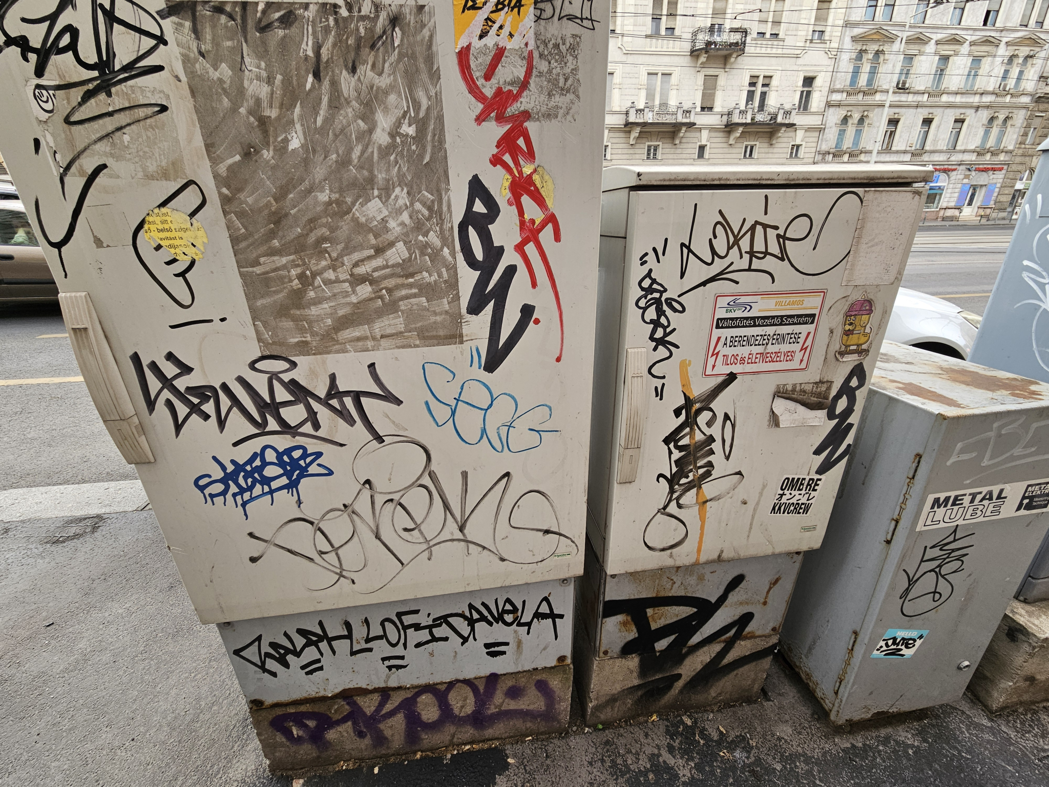 Egy graffitis és matricás BKV szekrény található a Ferenc körúton, a Mester utca mellett.
