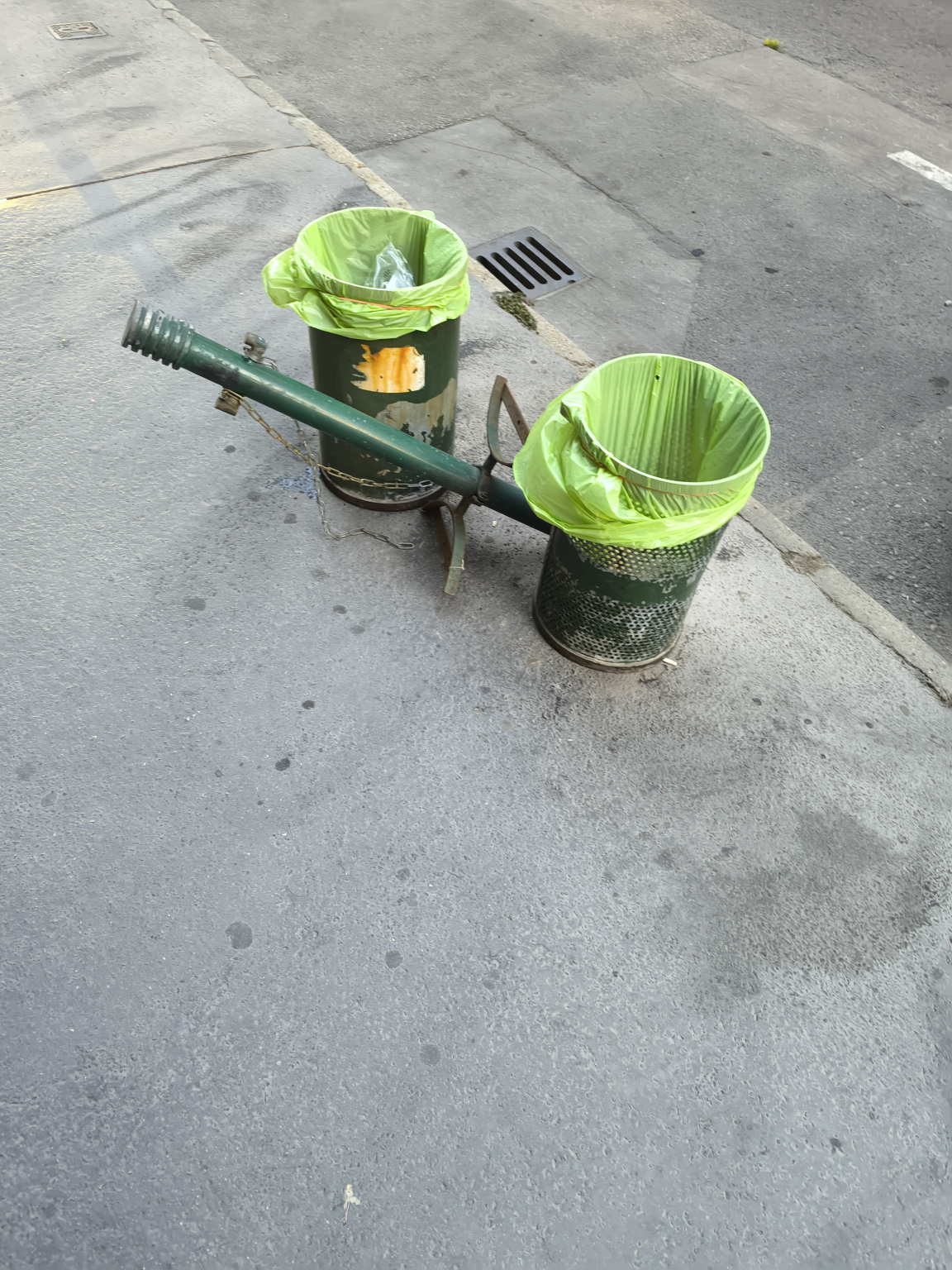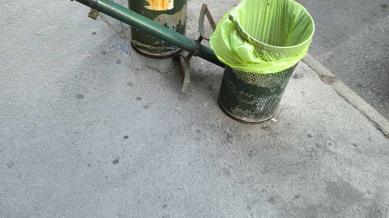 Feldöntve/leszakadva találtam a Murányi utca 37. előtt egy köztéri kukát (7. kerület).