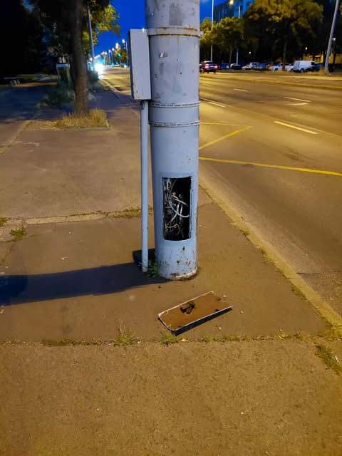 Az Üllői úton, az Ecseri út metrómegálló mellett, a kőbányai oldalon, az éjszakai buszok megállójánál, a volt Postás Hotel (jelenleg: Európai Rendőrakadémia, CEPOL) előtt, az Üllői út 114-118-nál leesett az egyik villanyoszlop oldaláról a fedőpanel, kilátszanak a vezetékek.