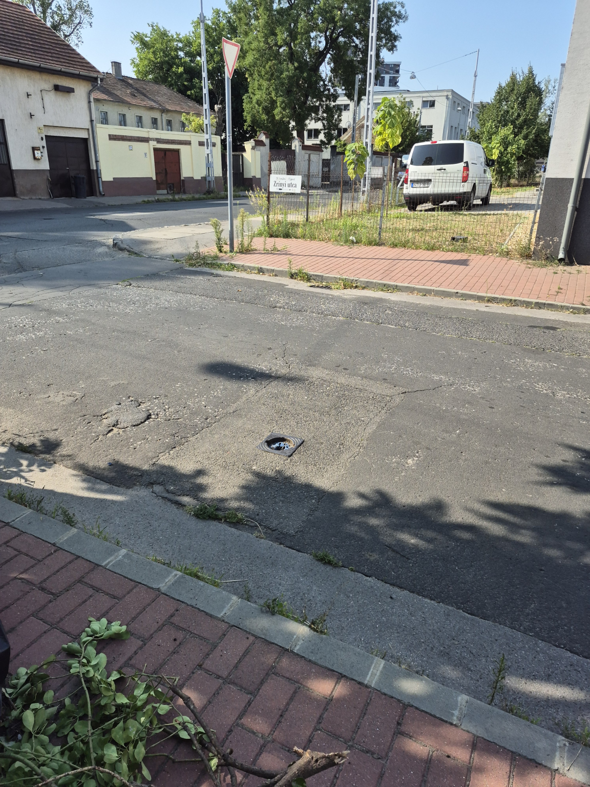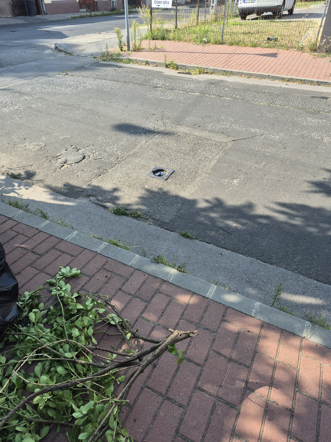 Az úttesten egy rész hiányzik a vízelvezetőről.