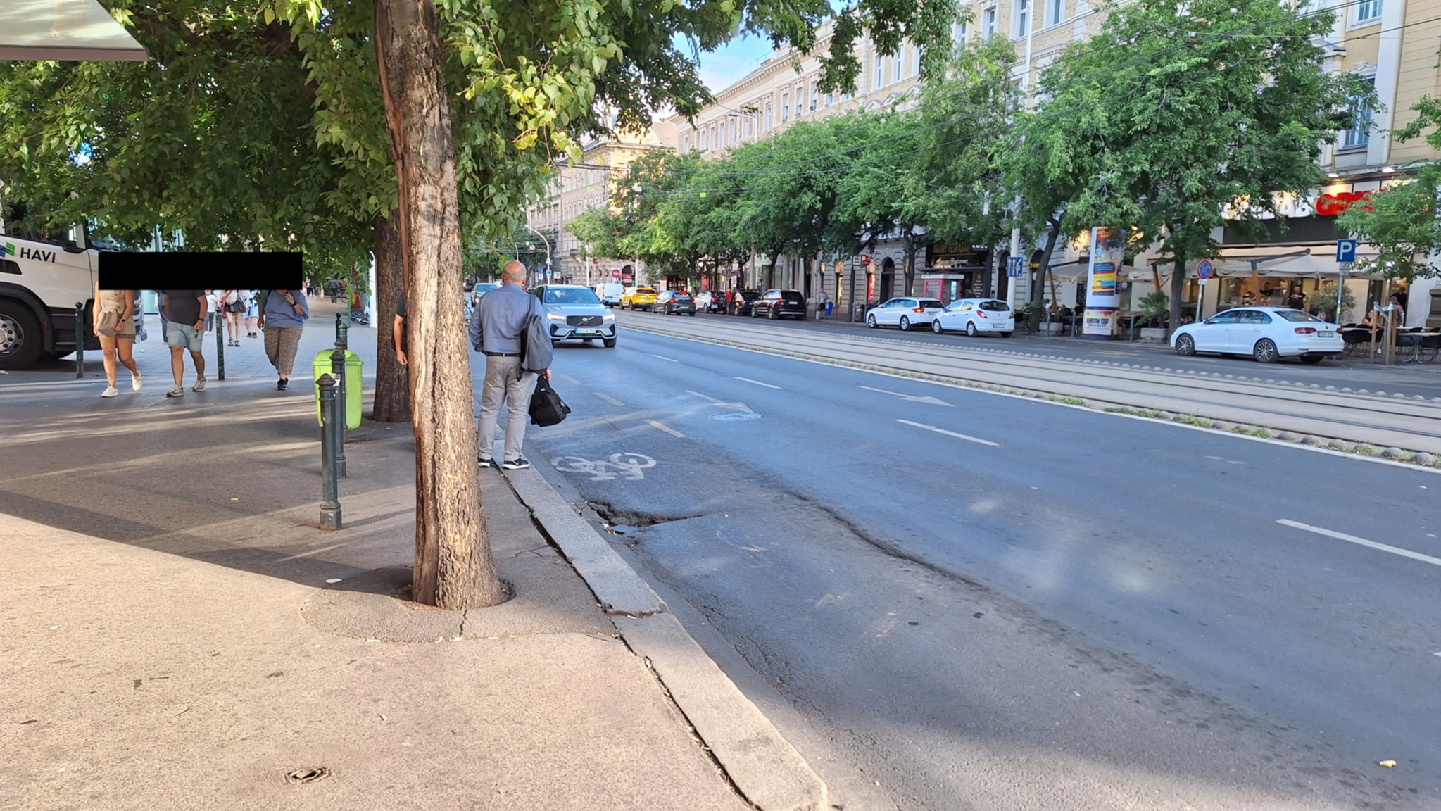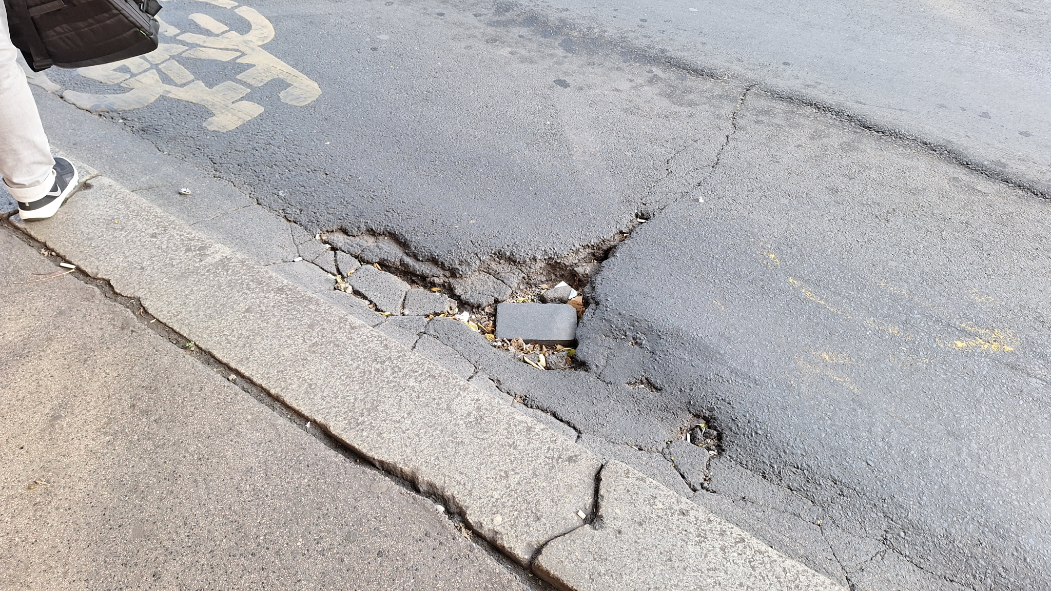 A Nyugati pályaudvar előtti buszmegállónál van egy hatalmas kátyú az út szélén.