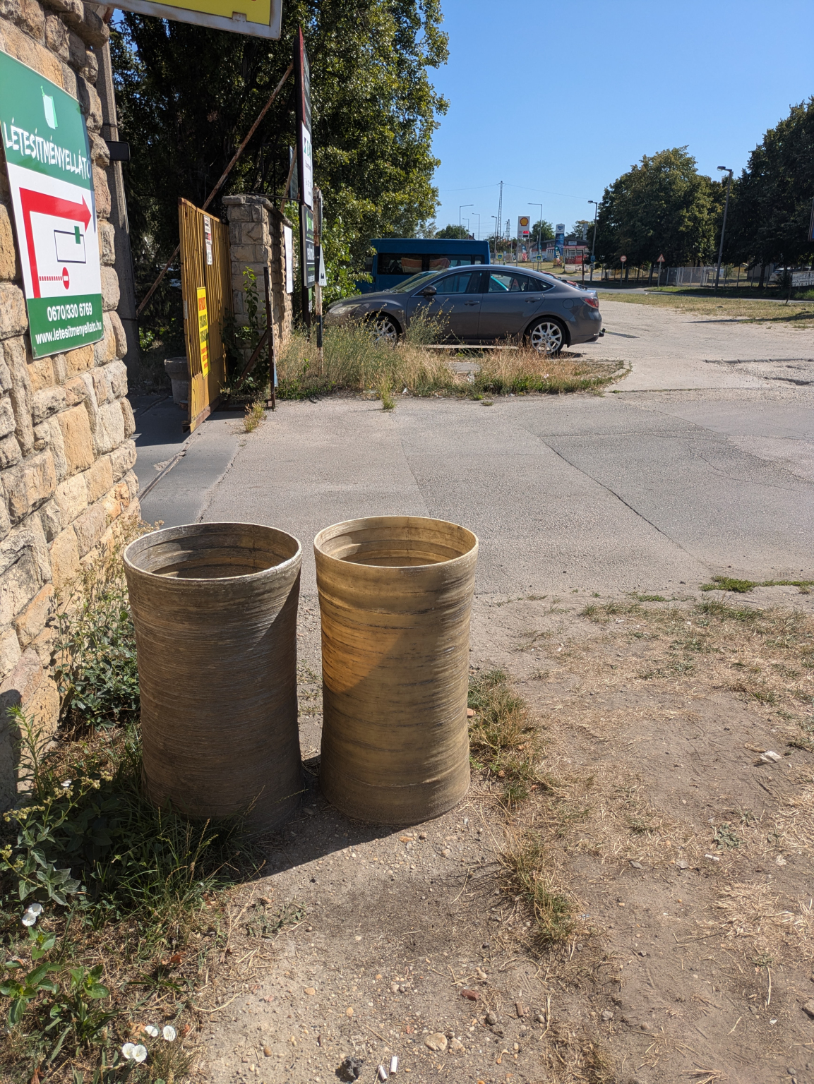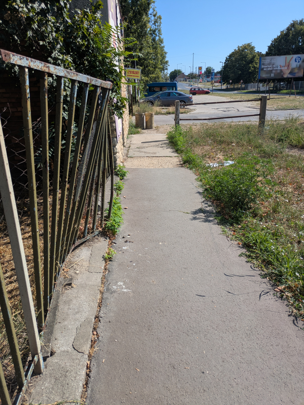 Itt a kerítés félig rá van dőlve a járdára, nem tudom mi tartja... valamint a járdán van két hordó is letéve ami ronda és akadályozza a forgalmat is.
