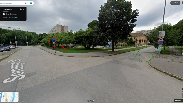 A helyes válasz a C: 300 méterrel korábban jobbra kellett volna menni a Miklós tér-Miklós utcán. Ha jobbra nézel pont van egy kivehető nyom, na ebből találd ki, hogy igazából arra akarsz menni, amikor az EV6 táblája előre mutat. A Folyamőr utcán egyébként burkolat sincs nagyon, nemhogy felfestések, és tábla se mondja, hogy hülye amúgy menjél jobbra (érdekes módon ezt a látnivaló/gyors útvonalopciókat a Római partnál sikerült megugrani ugyanabban a kerületben).