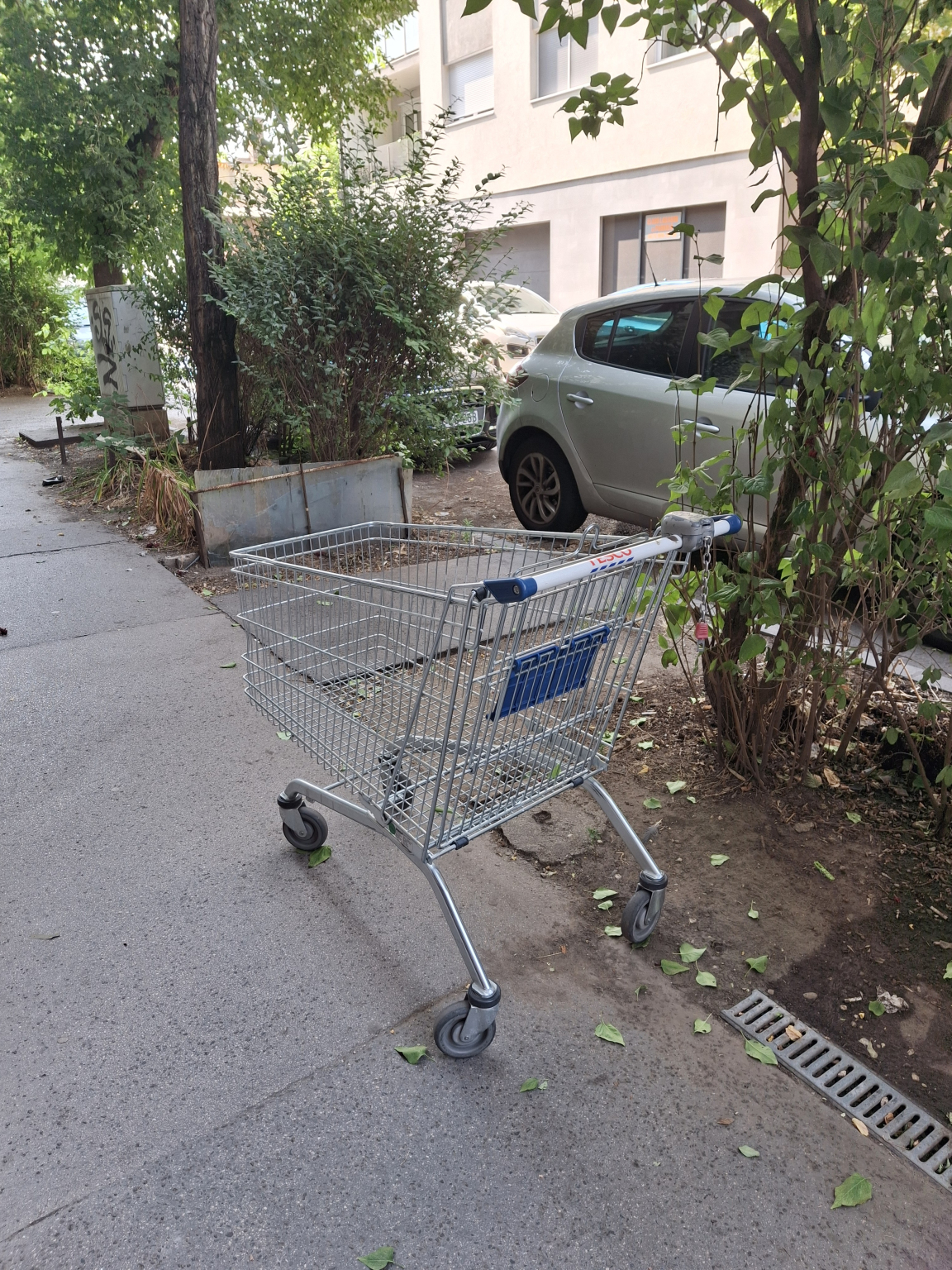 Tescos bevásárlókocsi van széthagyva a Bíbor utcán.