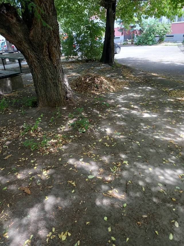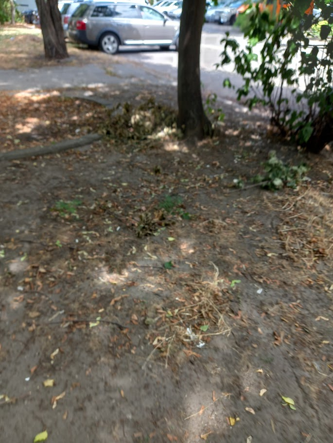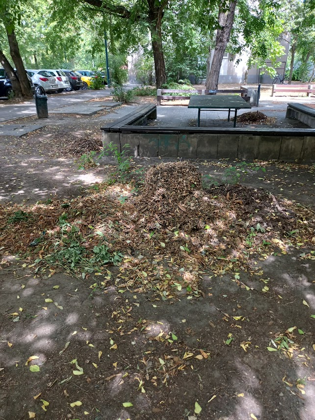 A Bp., XIV. kerület, Szentmihályi u. 31 és a 33. számú ház mögött a parkolóban és parkban is több kupac tavalyi avar és ágnyesedék várja az elszállítást.