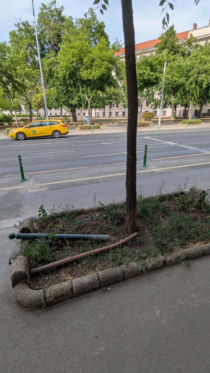 Kidöntött poller. Kérem, javítsák meg vagy távolítsák el őket. Köszönöm.