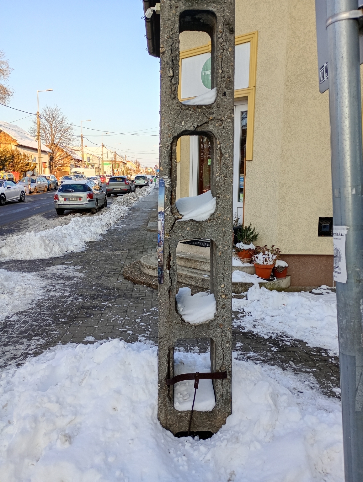 Köszönjük a bejelentését. Tájékoztatjuk, hogy a jelzett címen a hiba nem a BDK Kft. illetékességébe tartozik. A betonoszlop az ELMŰ tulajdonát képezi.