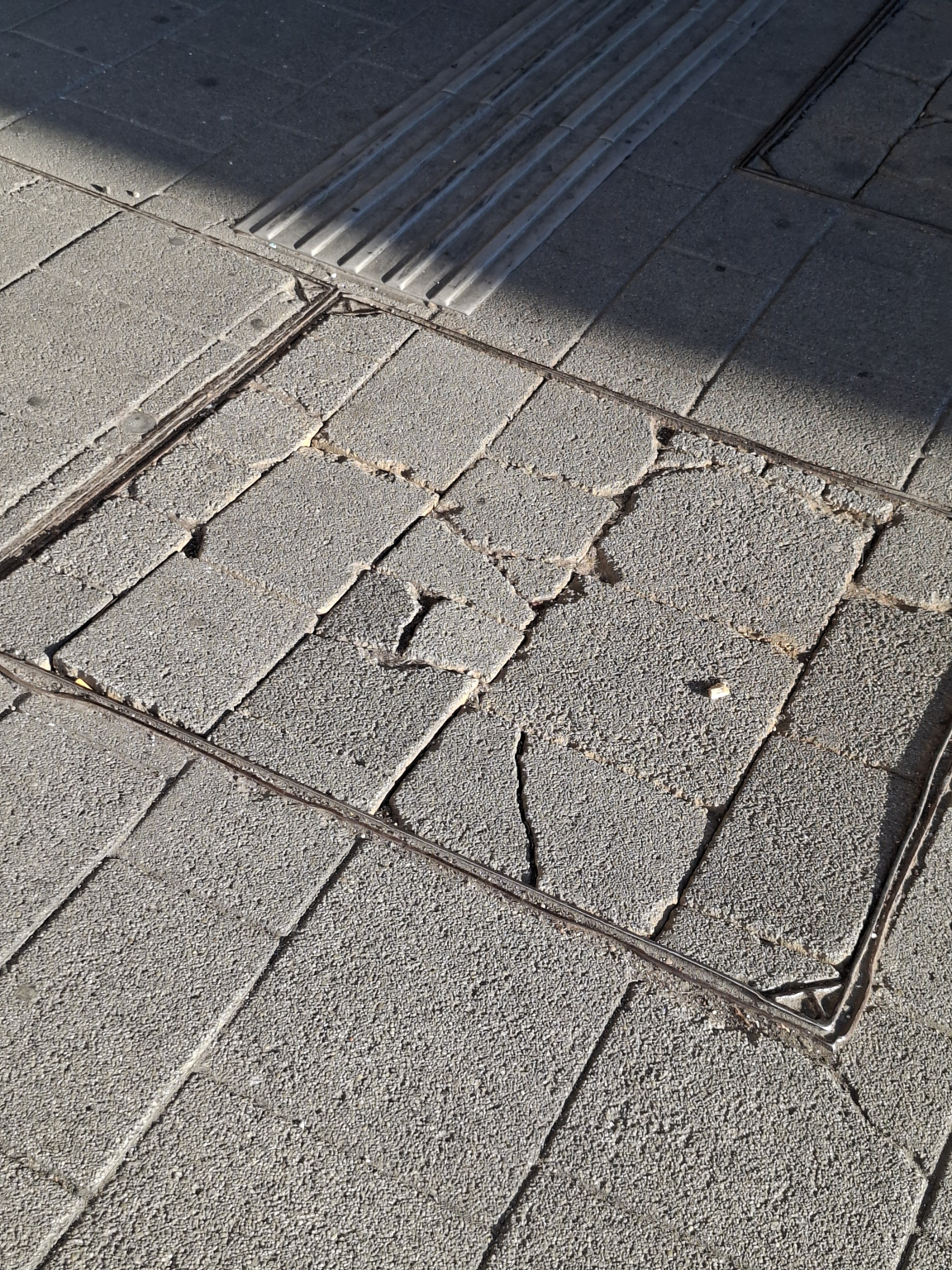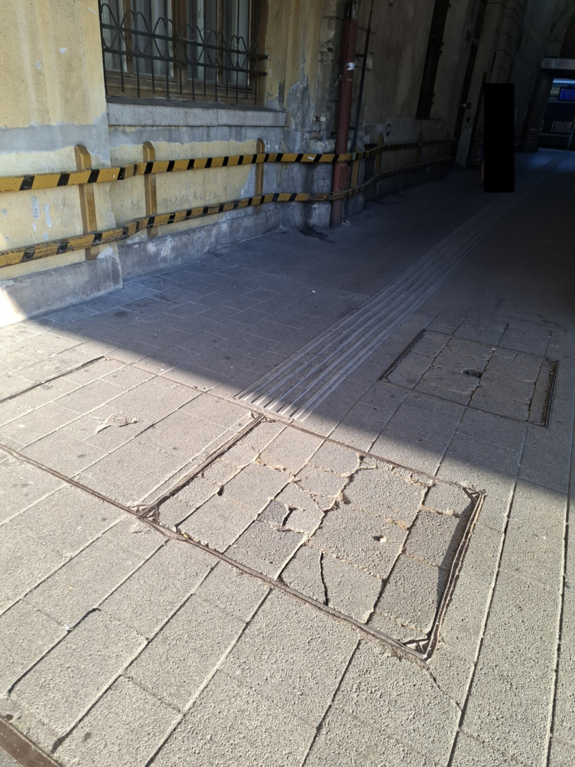 A Posta előtt a fedlap megsüllyedt (homorú a közepe) és a benne lévő útburkolati jelek összetörtek.