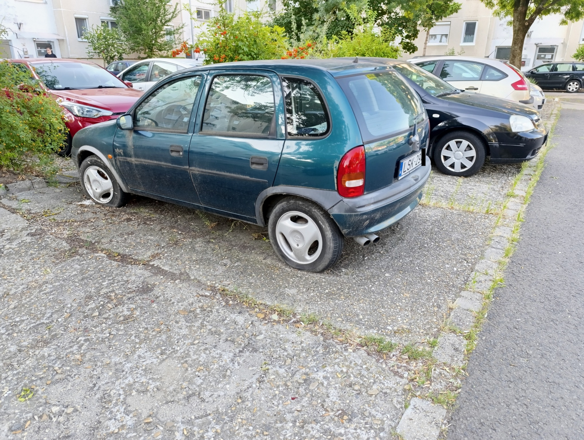 A képen látható autó egy ideje foglalja a parkolóhelyet, már a gumi is leeresztett