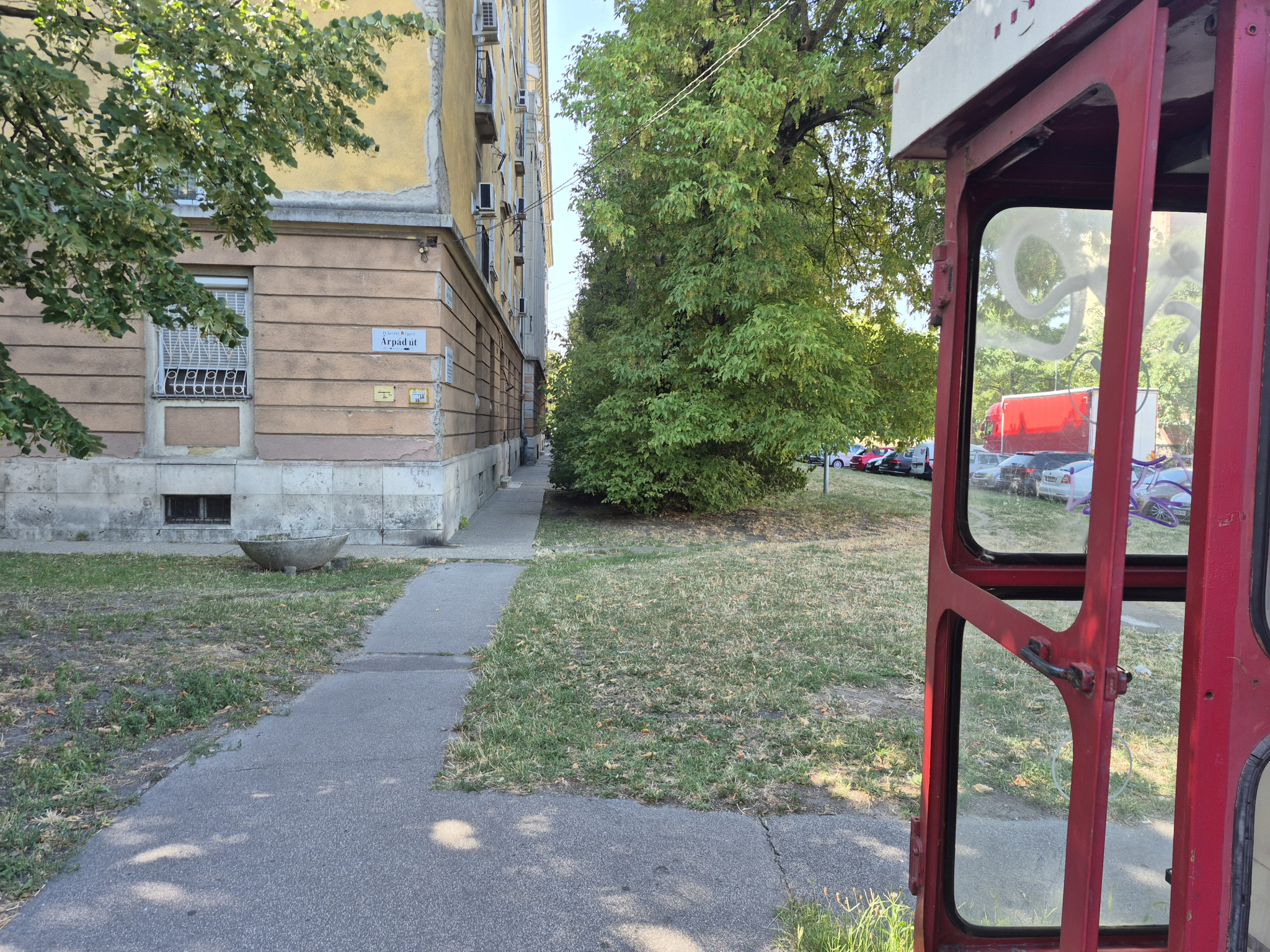 A telefonfülke üvegeinek egy része hiányzik, egy része graffitis. A fülke felső részének borítása már lesöndörödni kezdett.