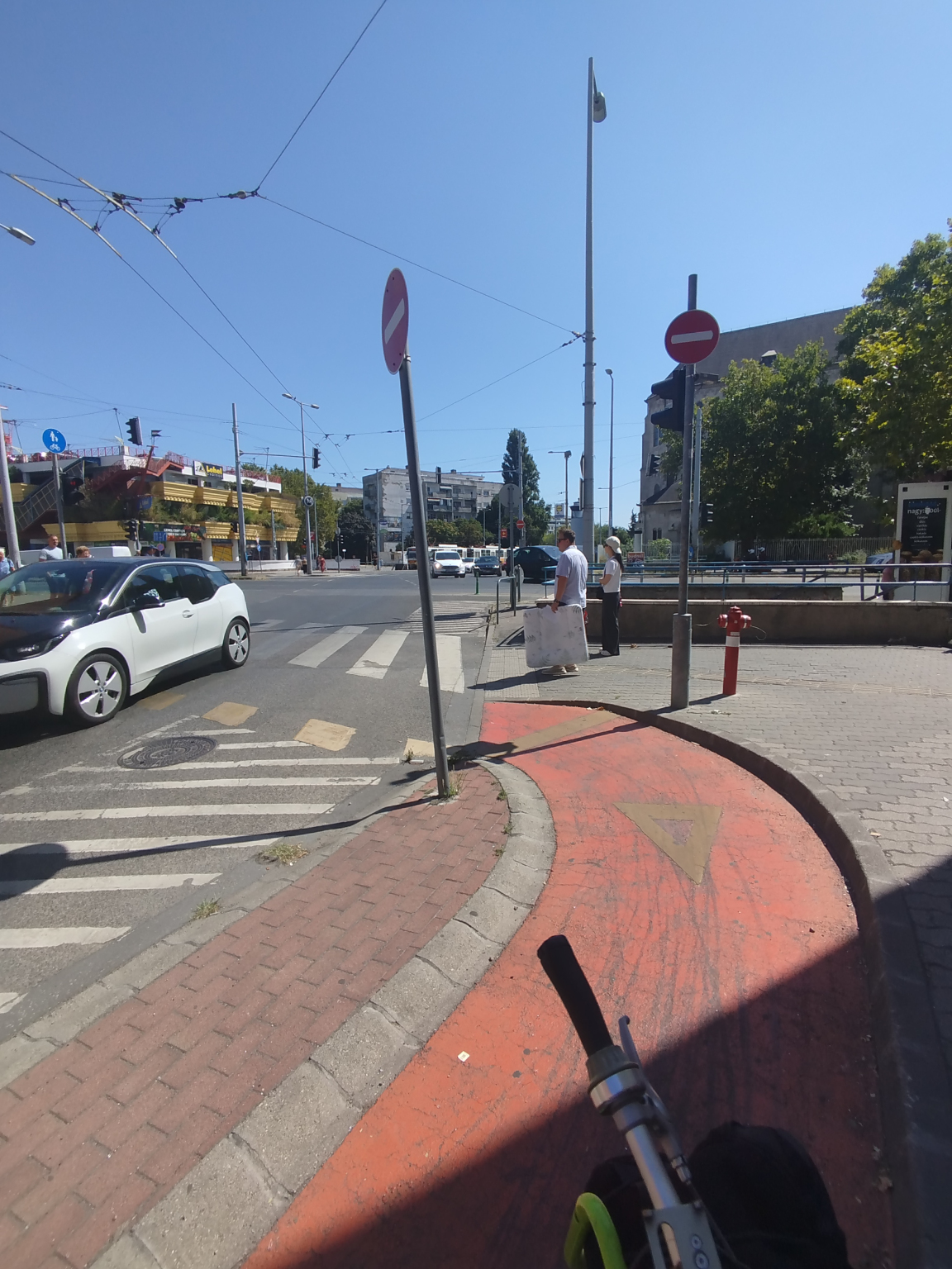 A képen szereplő kerékpárút alapvetően a Váci úton lévő BuBi állomás megközelítését szolgálja. A Victor Hugó utca északi járdája itt közös gyalogos-kerékpáros felület, ezt tábla é...