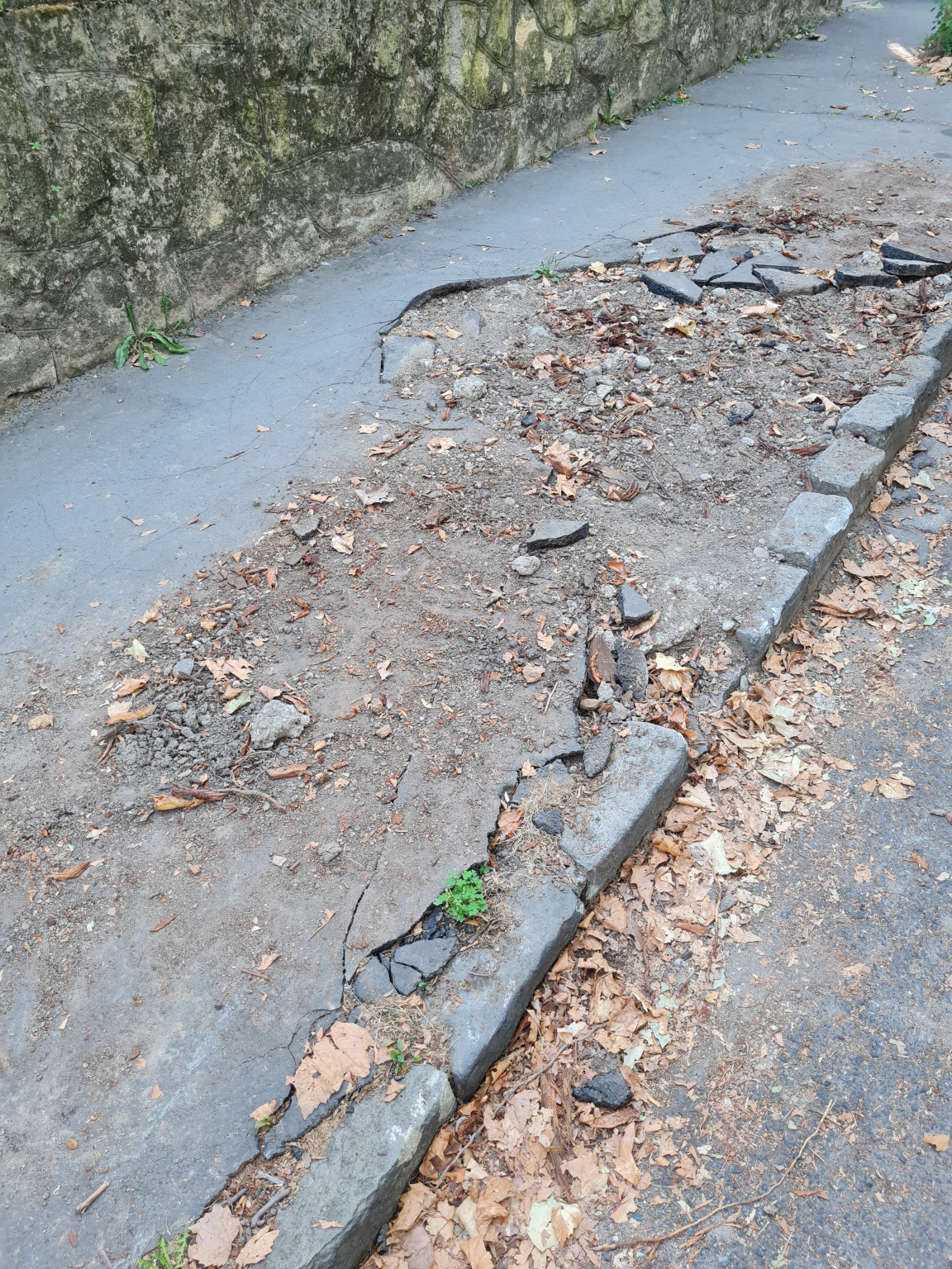 Platánfa gyökerének kiásása miatt a járda és a szegélykövek széttörtek, és ezáltal veszélyessé vált