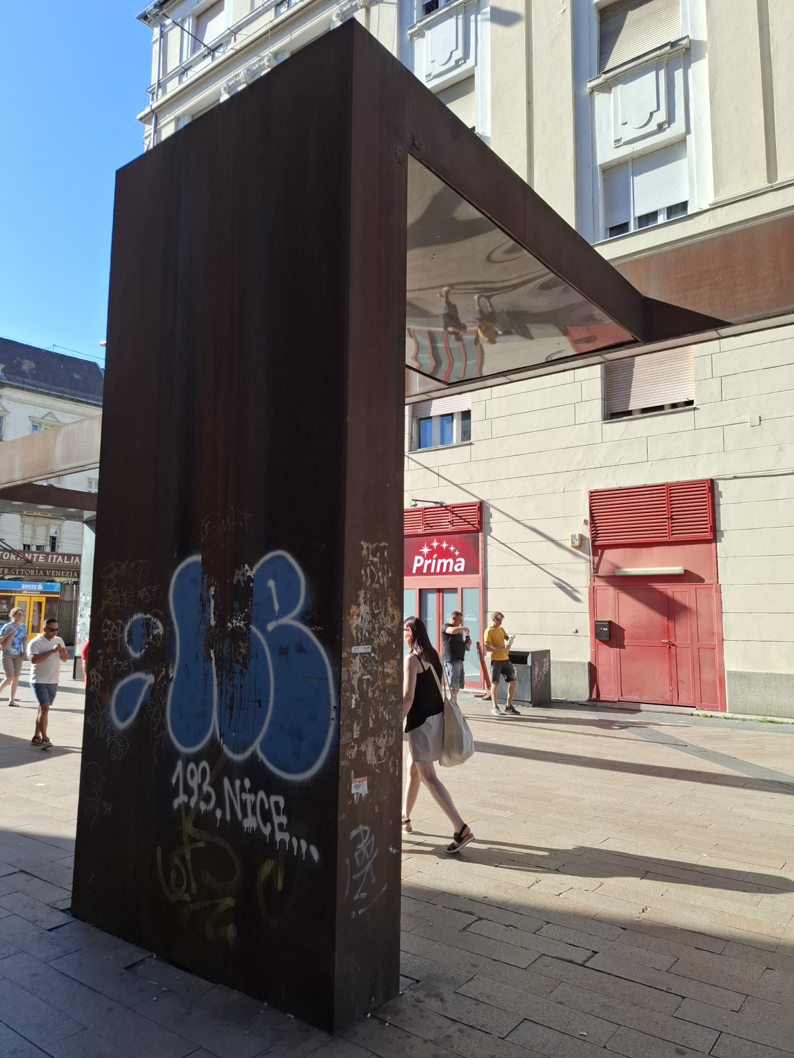 A Corvin köz bejáratánál a nagy fém műtárgy össze van graffitizve és matricázva. Kérem takarítsák le, nem méltó a helyhez!