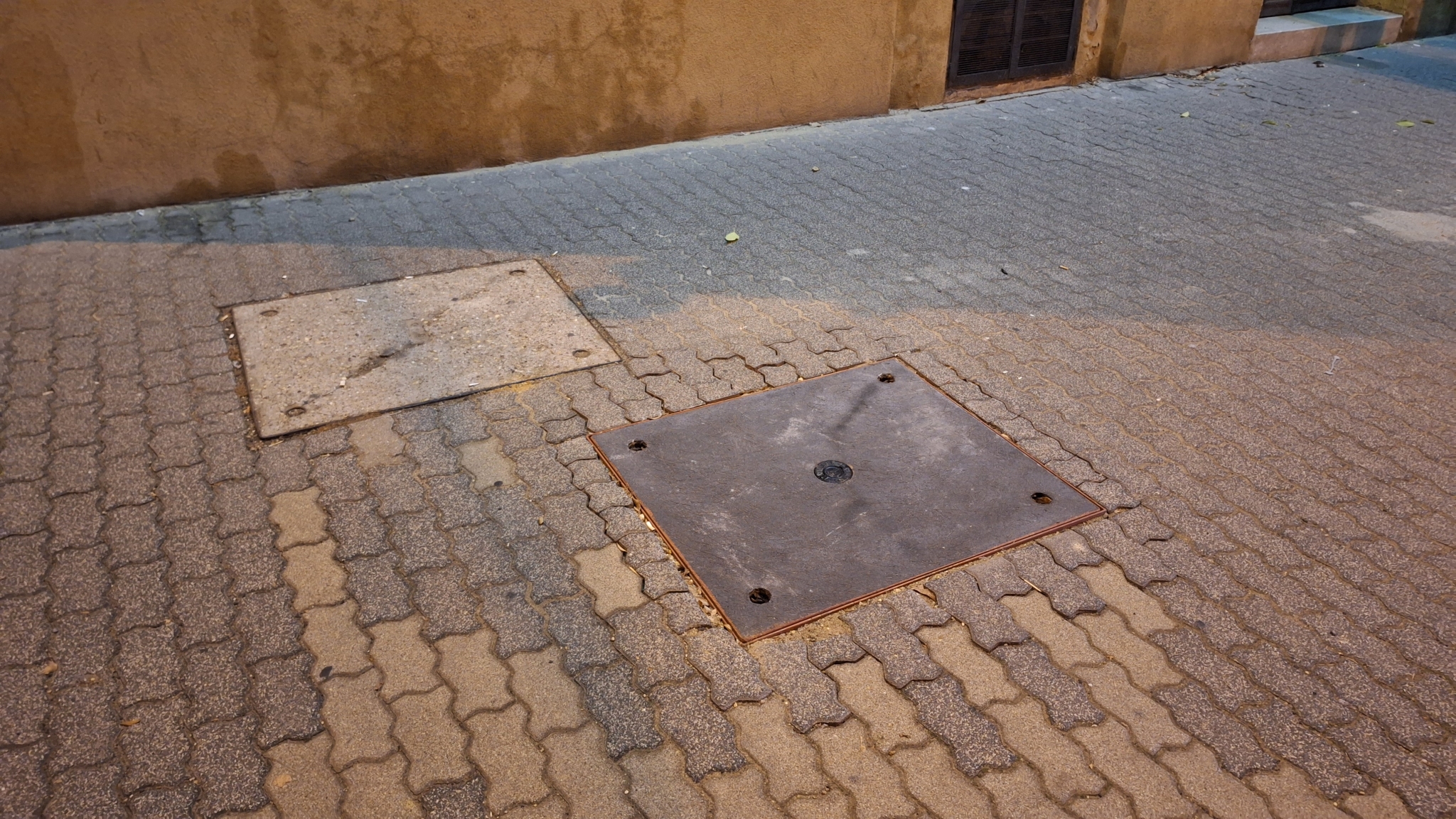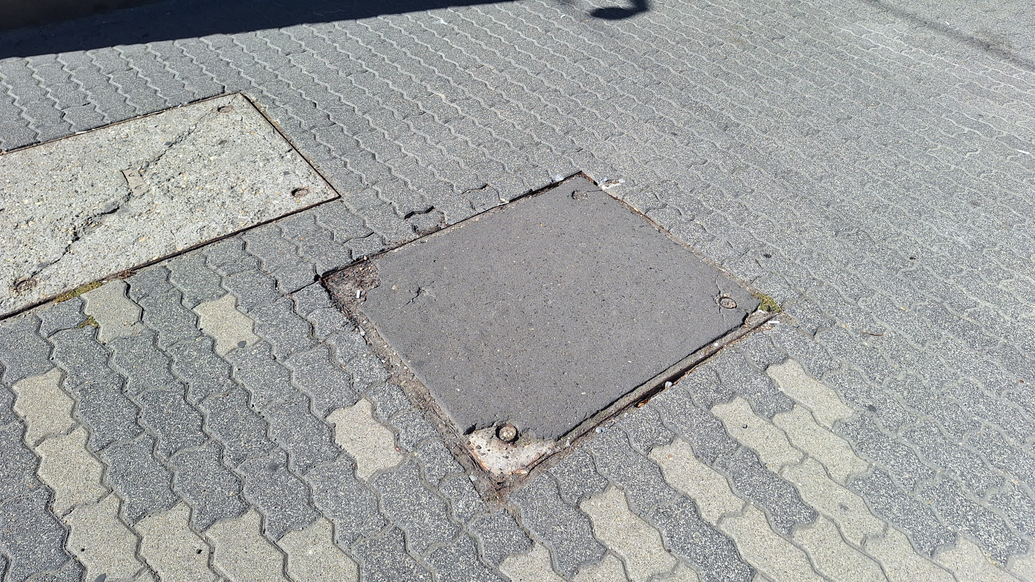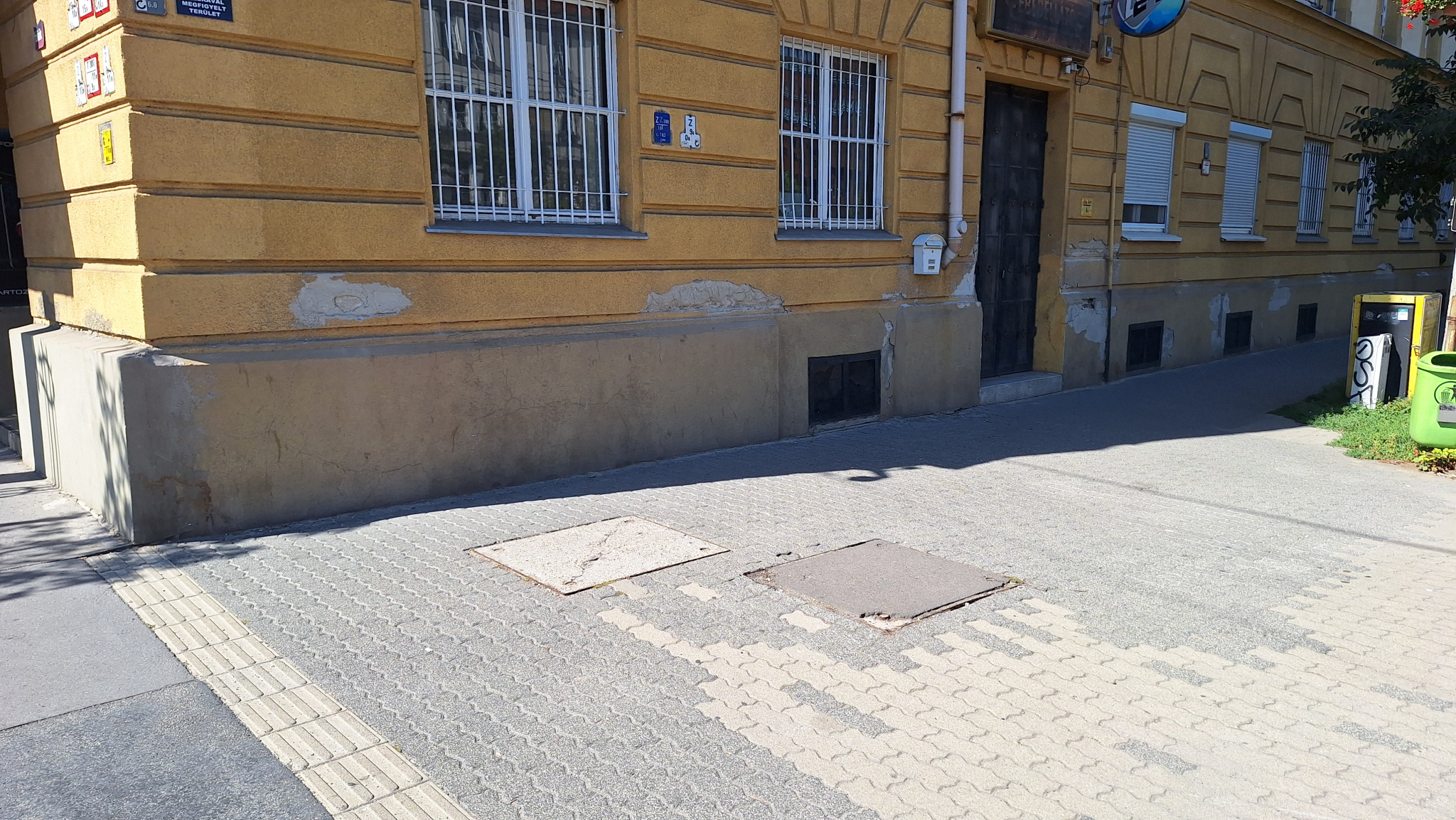 A Róbert Károly körút és a Pap Károly utca sarkán az egyik aknafedélnek a sarkokon hiányos az aszfaltburkolata.