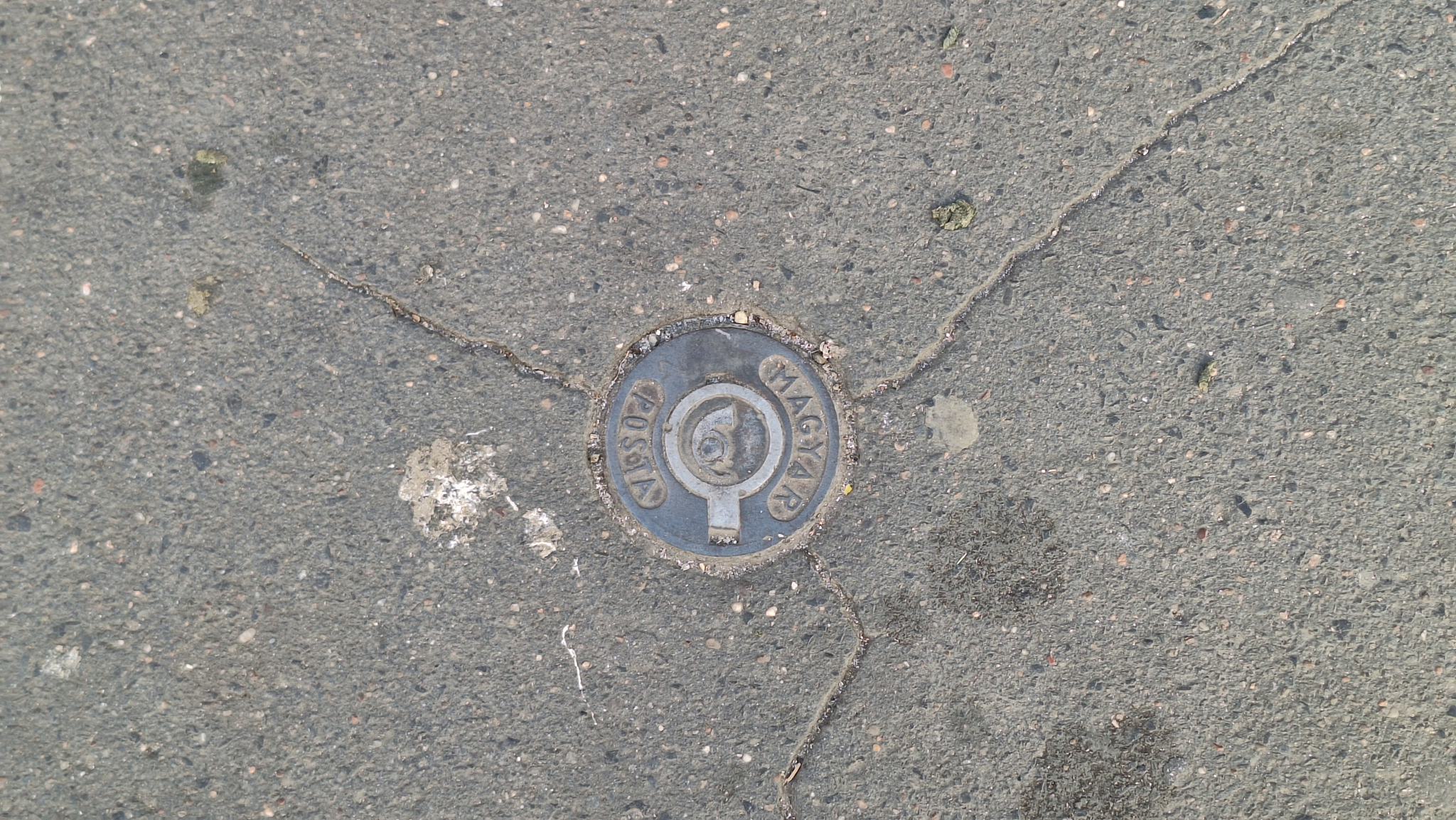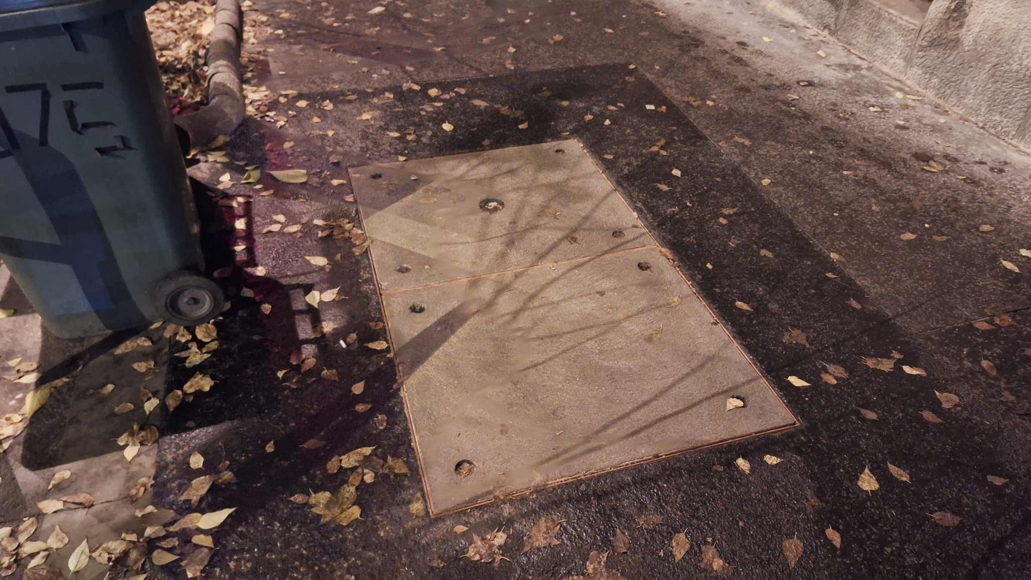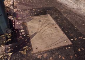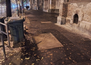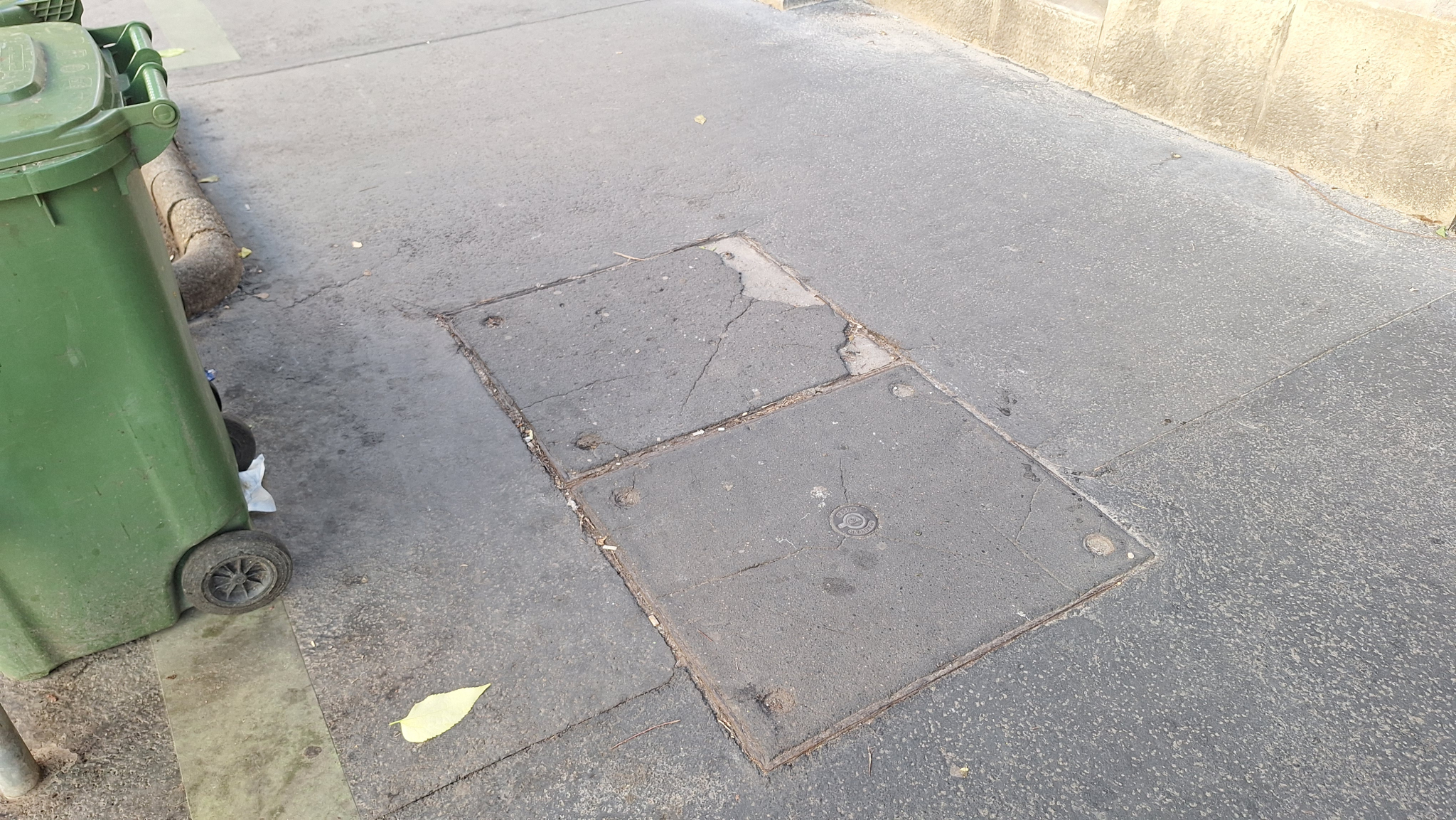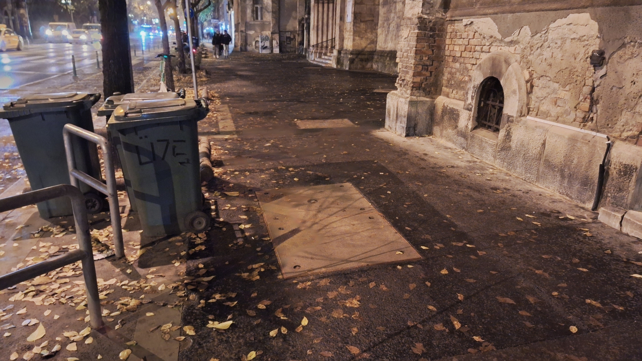 Az Üllői út 75. előtt van egy sérült burkolatú aknafedél.