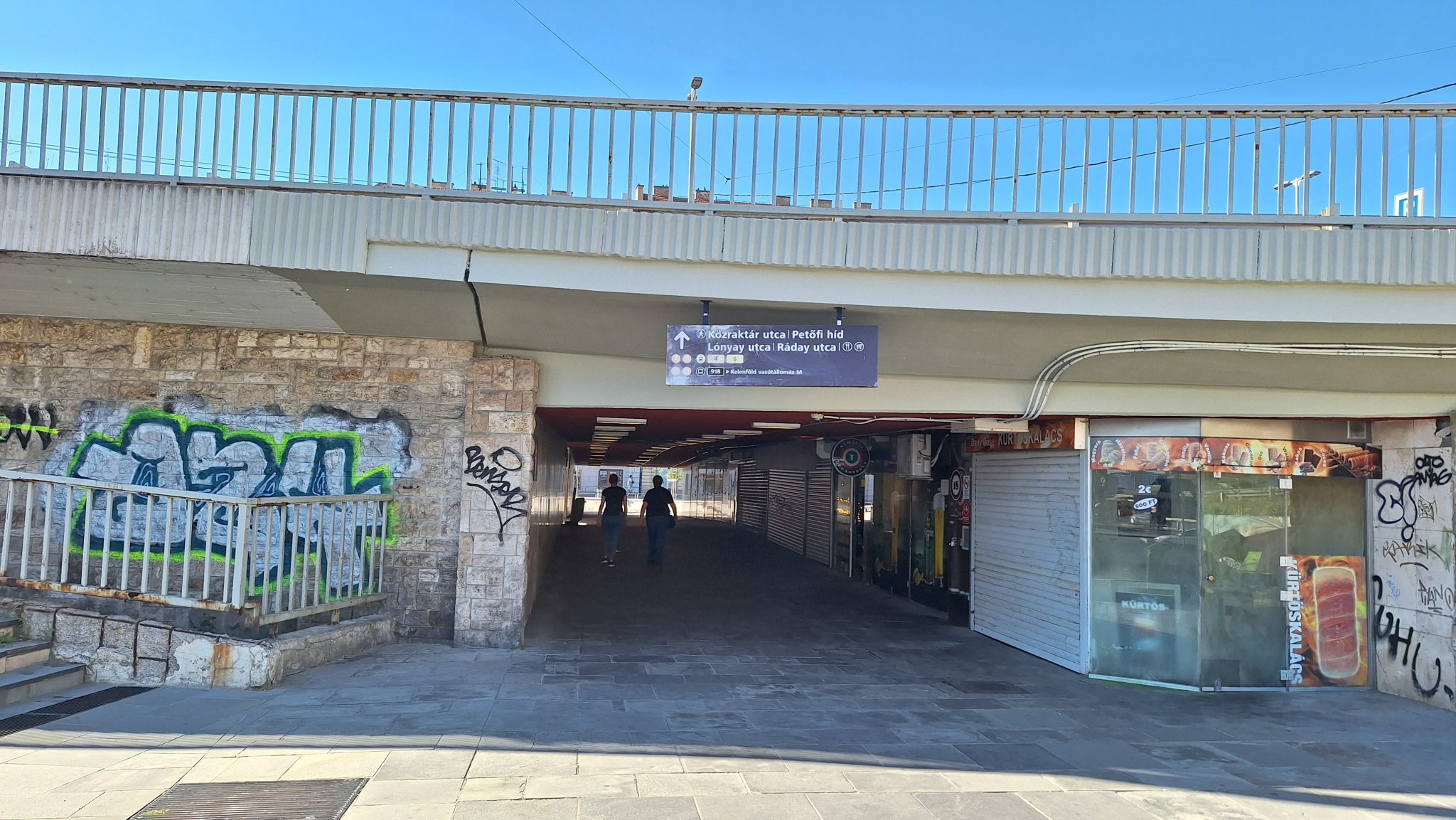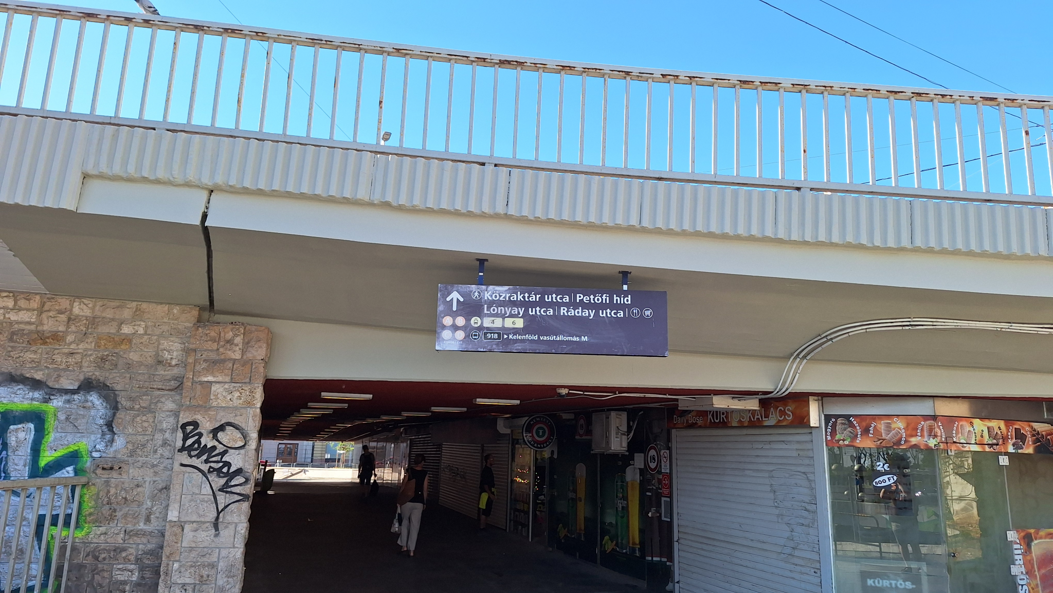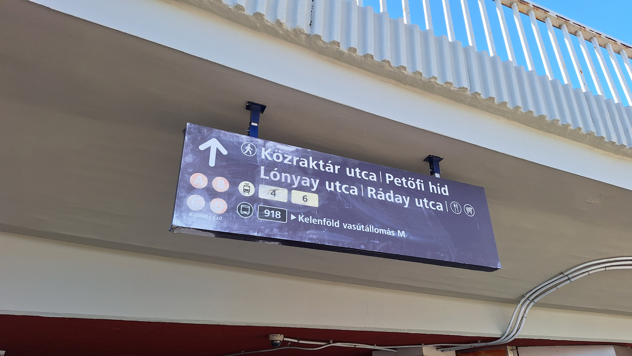 A Boráros téri aluljáró E kijárata fölötti táblára ráférne egy újrafóliázás, ki van fehéredve, nehezen látható.