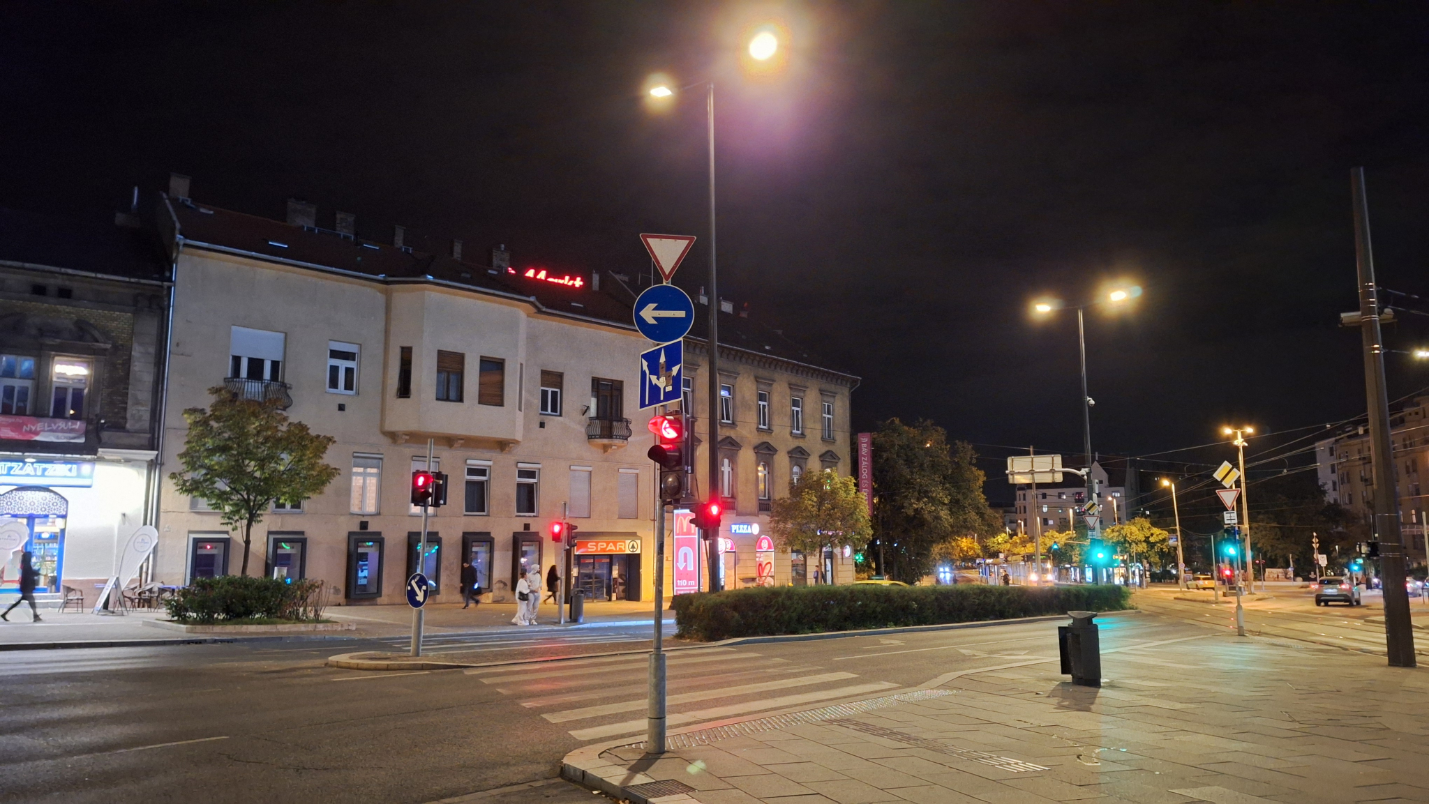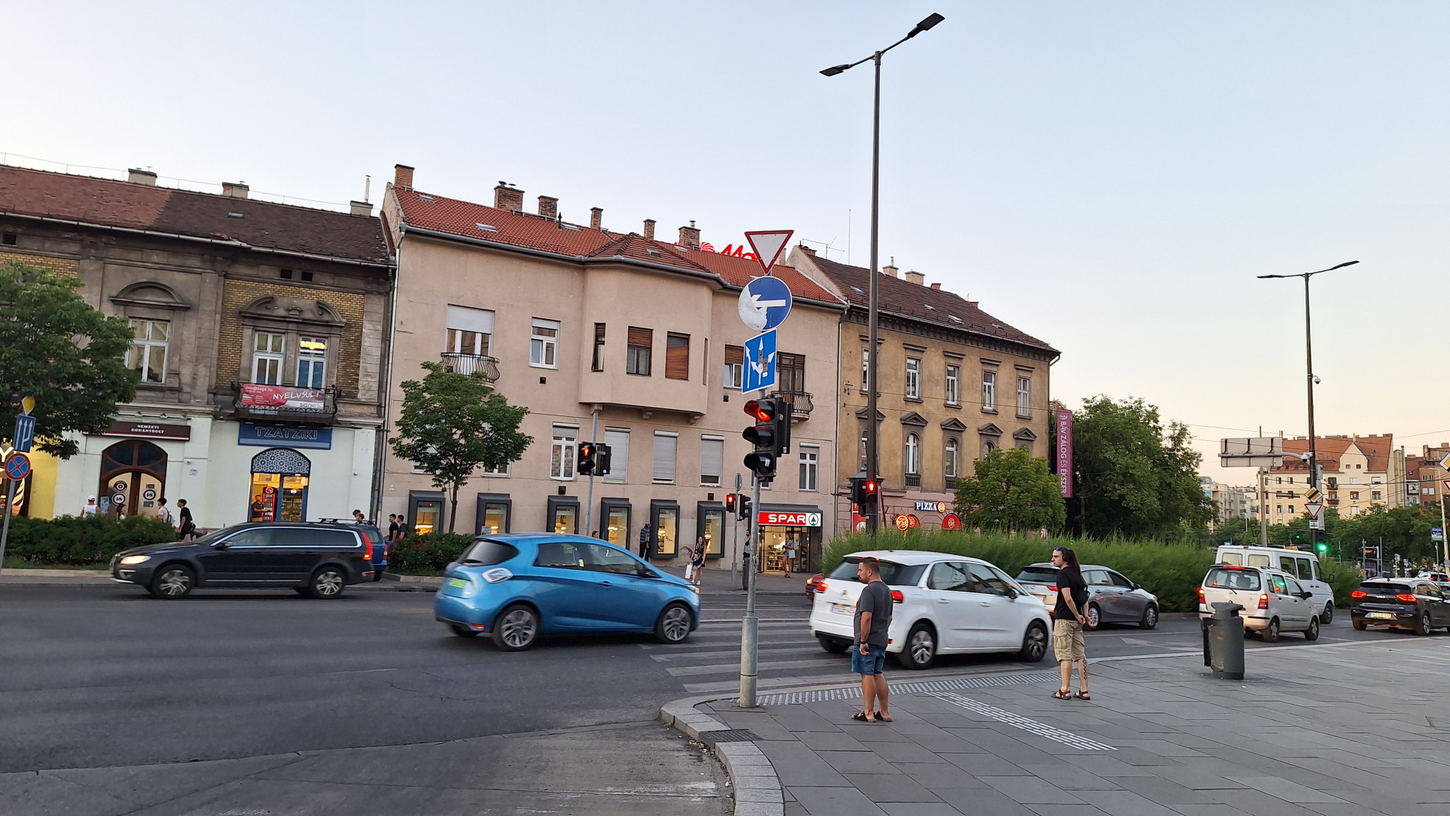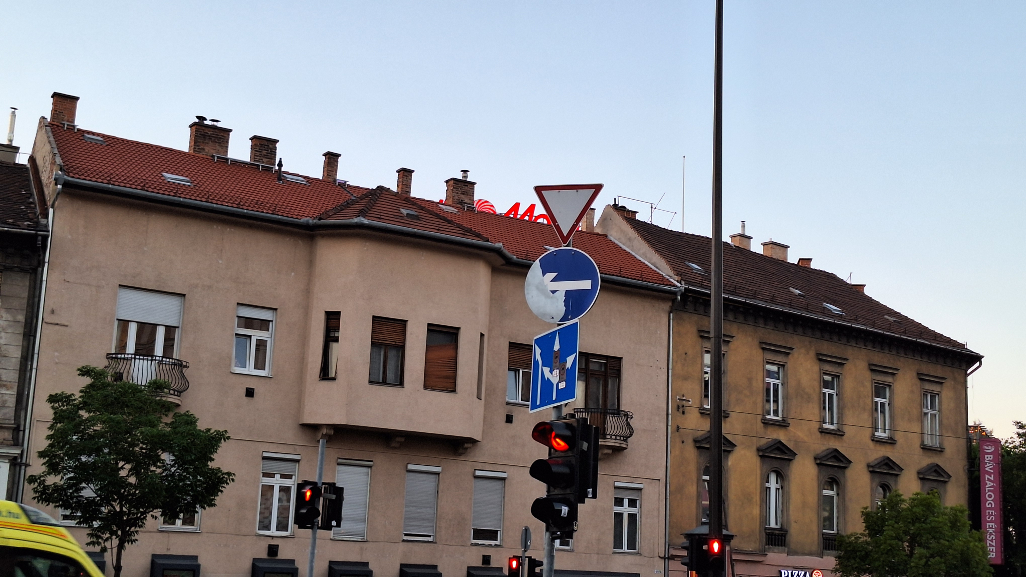 A Széll Kálmán téren a SPAR-al szemben van egy sérült kötelező haladási irányt jelző tábla.