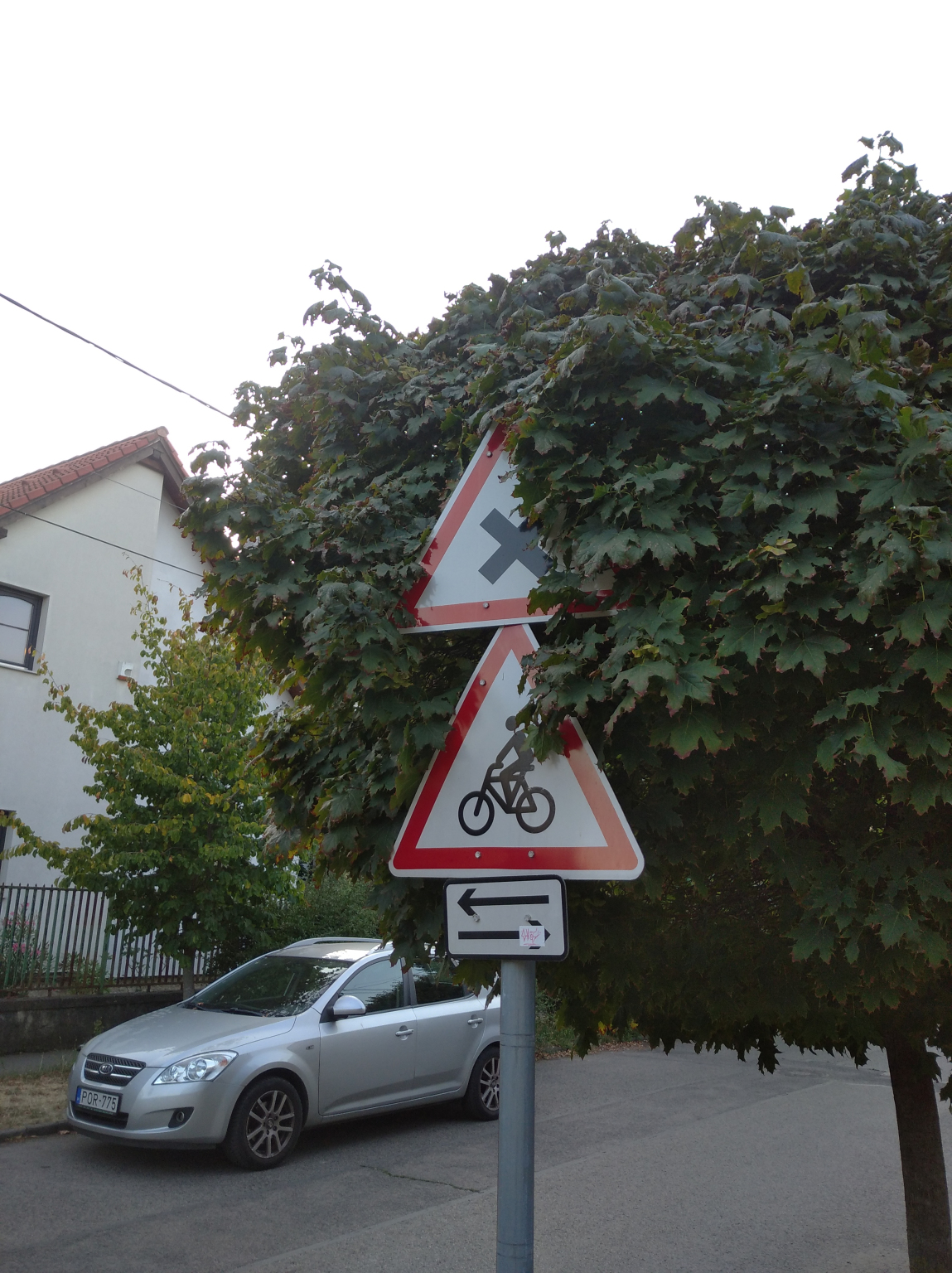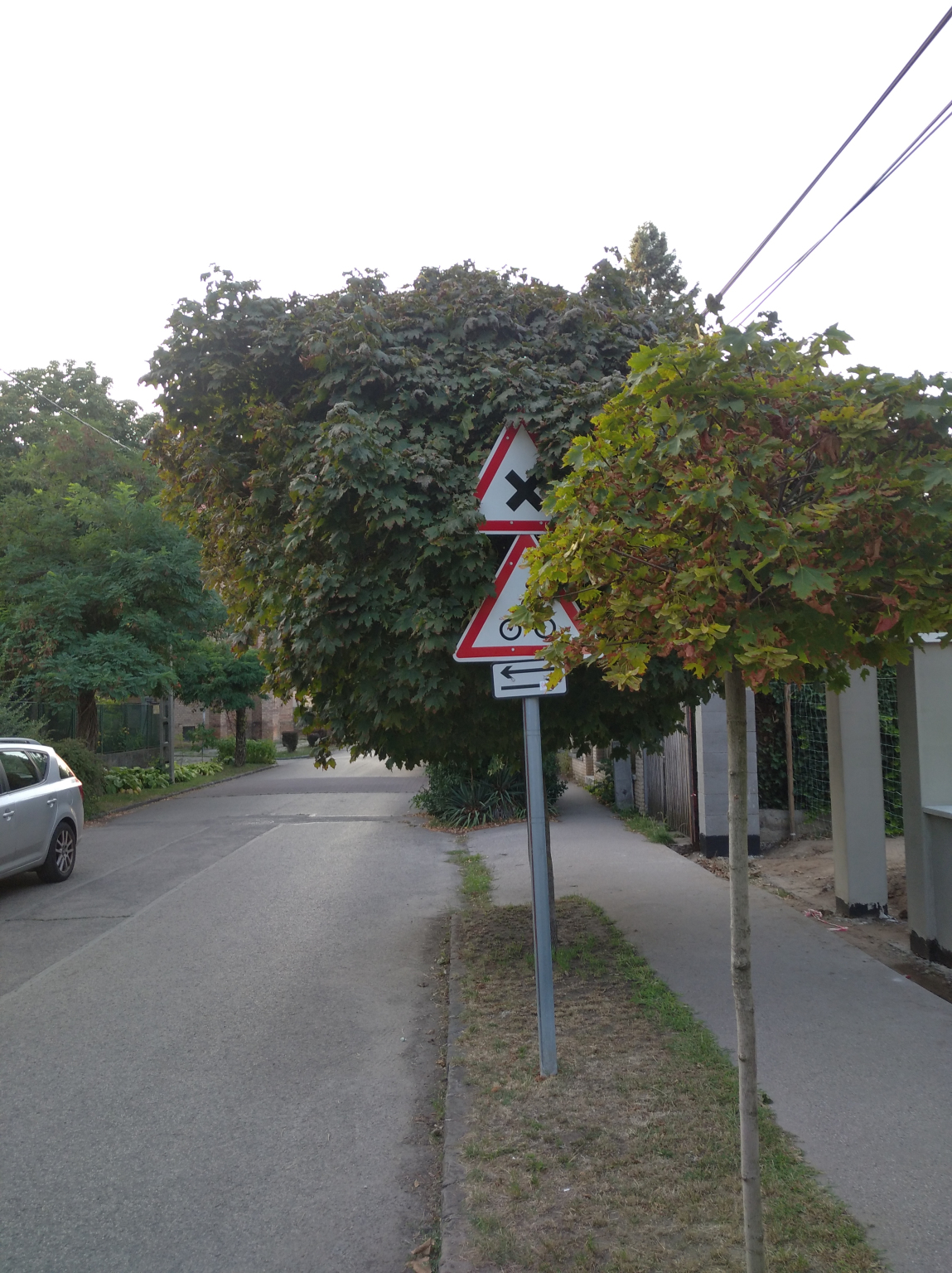 A kresz táblát tartó oszlopot kicsit arrébb kellene helyezni, mivel a fa lassan teljesen benövi.