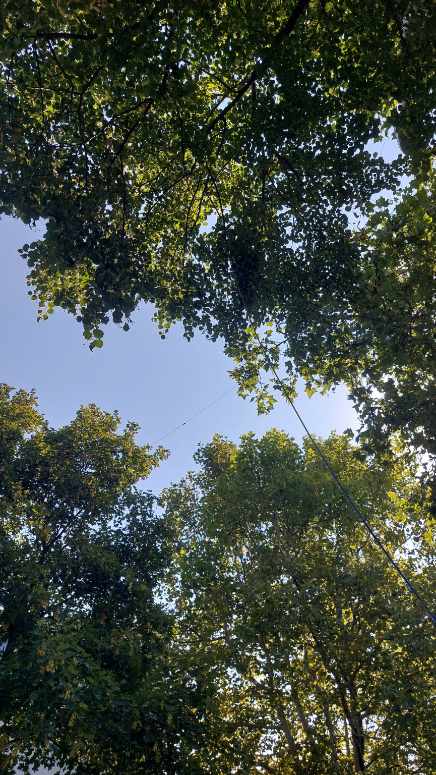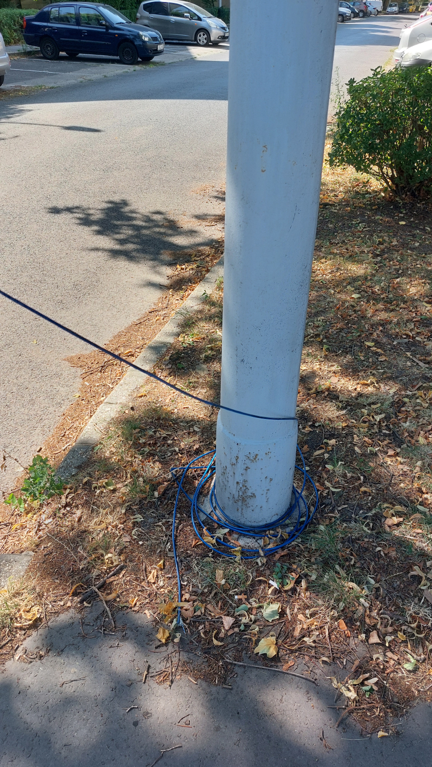 Az Eperjes utca - Ábrahám Géza utca sarkán egy kék színű vezeték lóg az egyik fáról a földig.