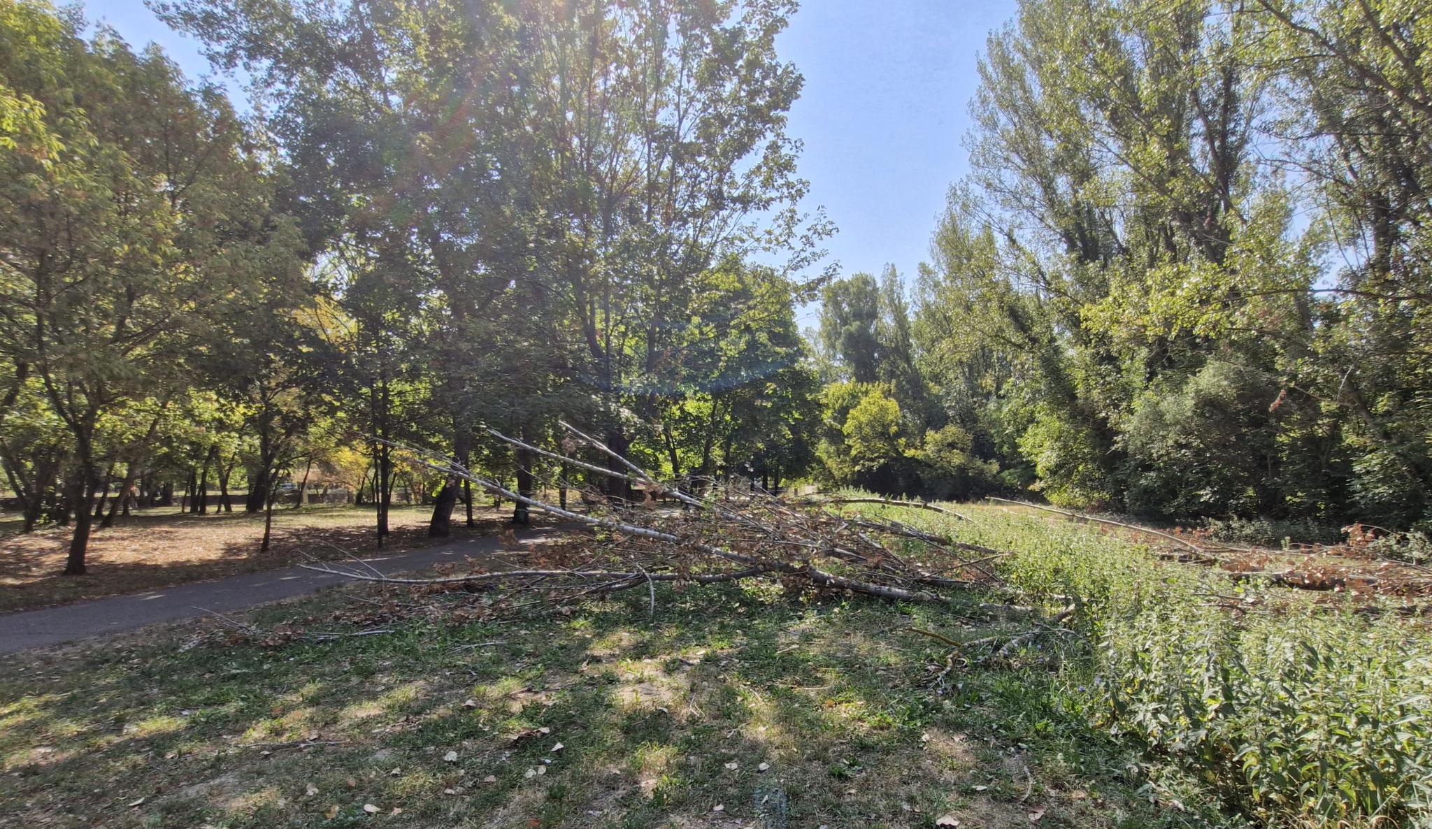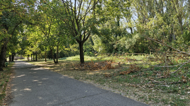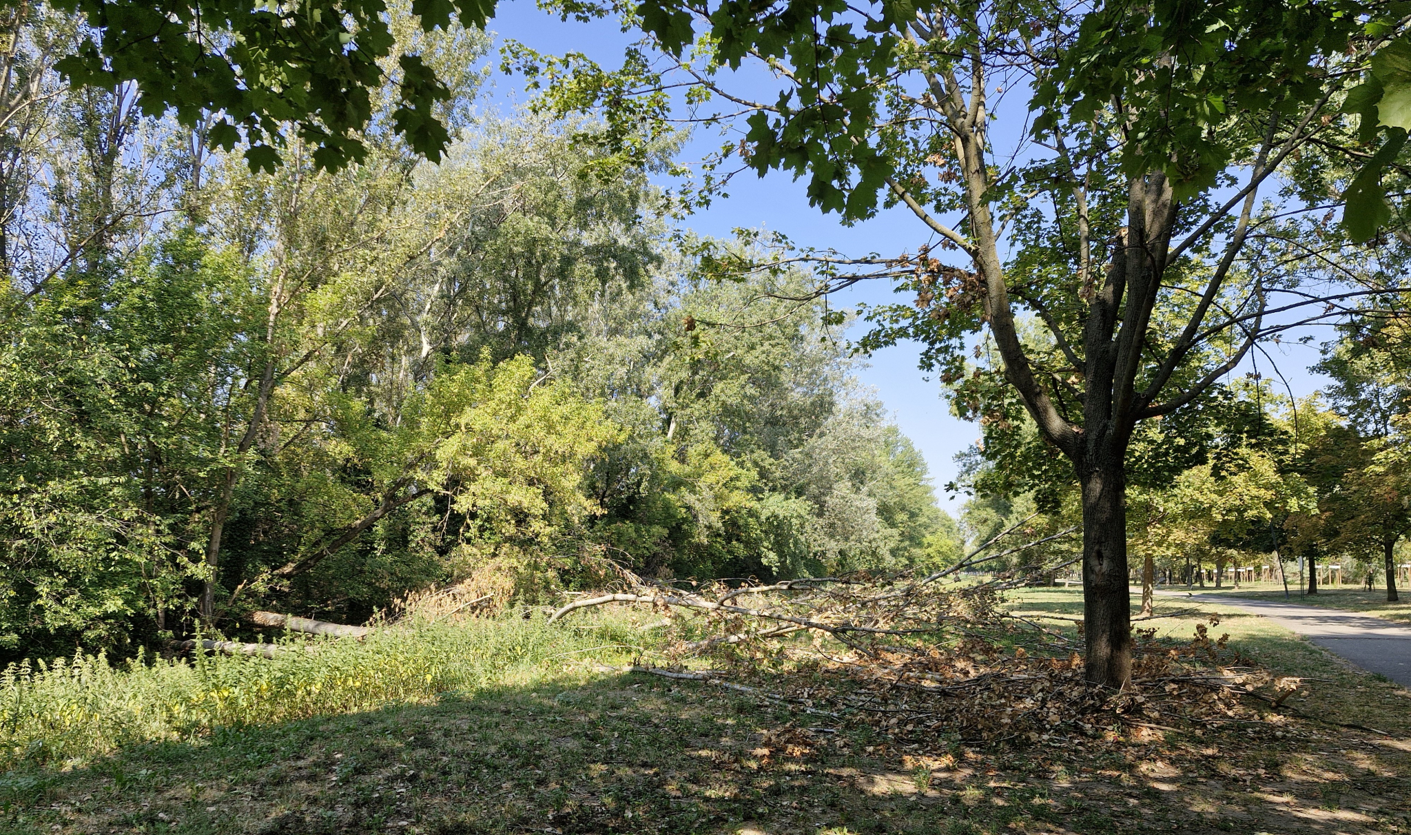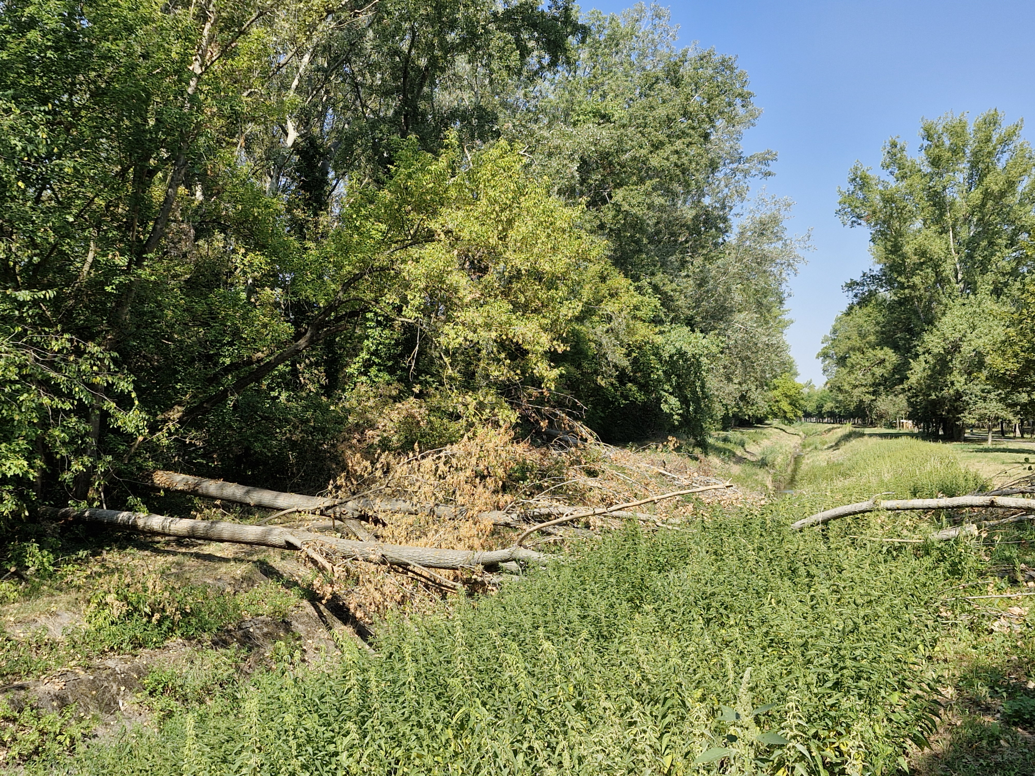 Újpesten a Szilas-parkon átfolyó Szilas-patakon keresztben több fa is kidőlt egy júliusi vihar következtében. A sétányt épp nem érinti, a kutyafuttató közelében találhatóak. Ma jártam arra újra, de a csalános miatt nem tudtam közelebb menni a képek kedvéért. Az elszáradó levelek, ágak potyognak a patakba. Ha majd valamikor megemelkedik a patak vize, biztosan gondot fognak okozni. Esetleg fel lehetne számolni? A túlparti csapás se használható sajnos.