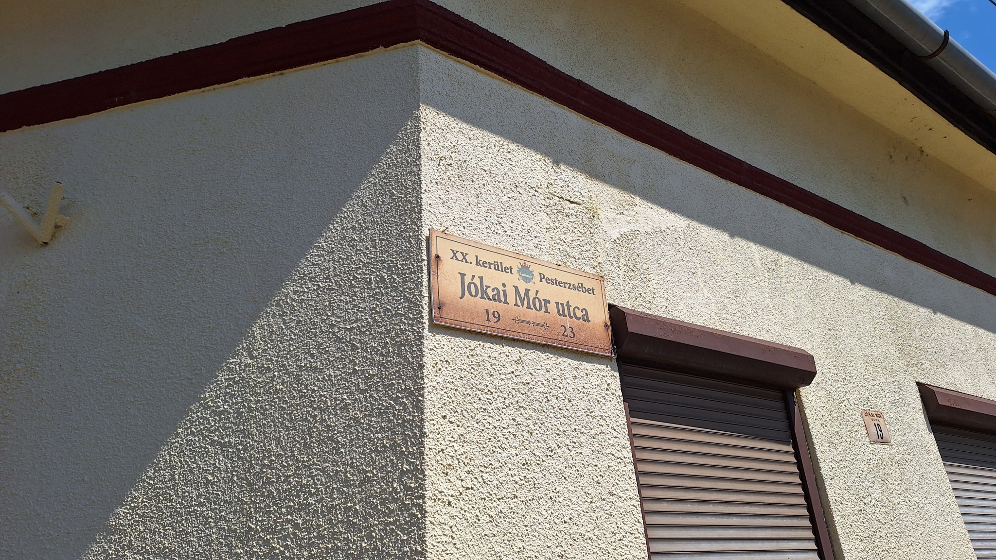 A Jókai Mór utca 19. falán lévő utcanévtábla el van színeződve.