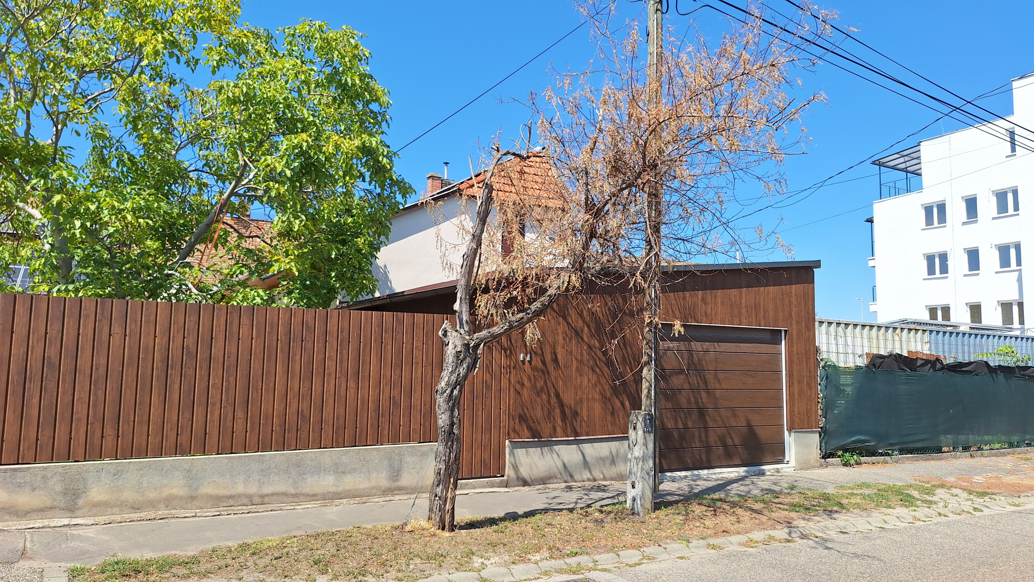 A Hunyor utca 1. előtt áll egy kiszáradt fa.