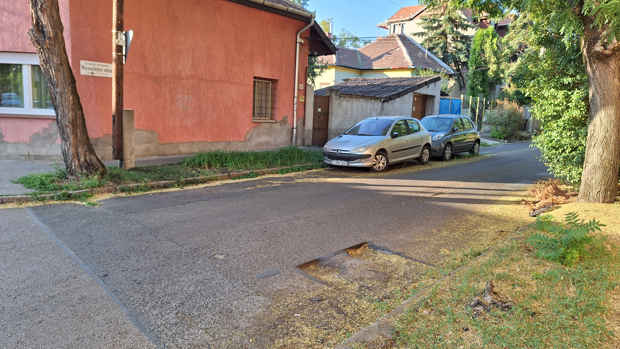 A Vörösmarty és Wesselényi utca sarkánál kátyús az úttest.