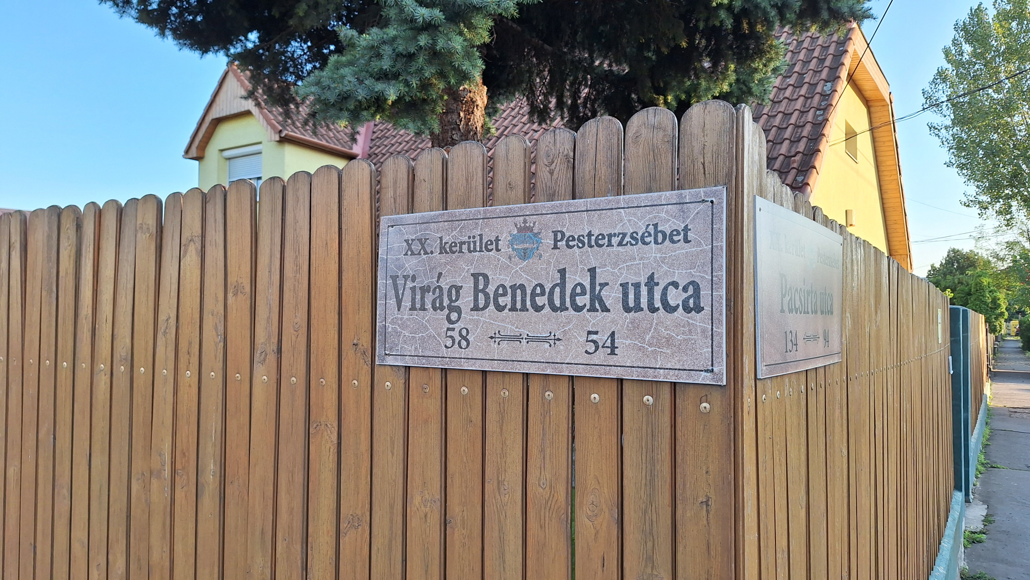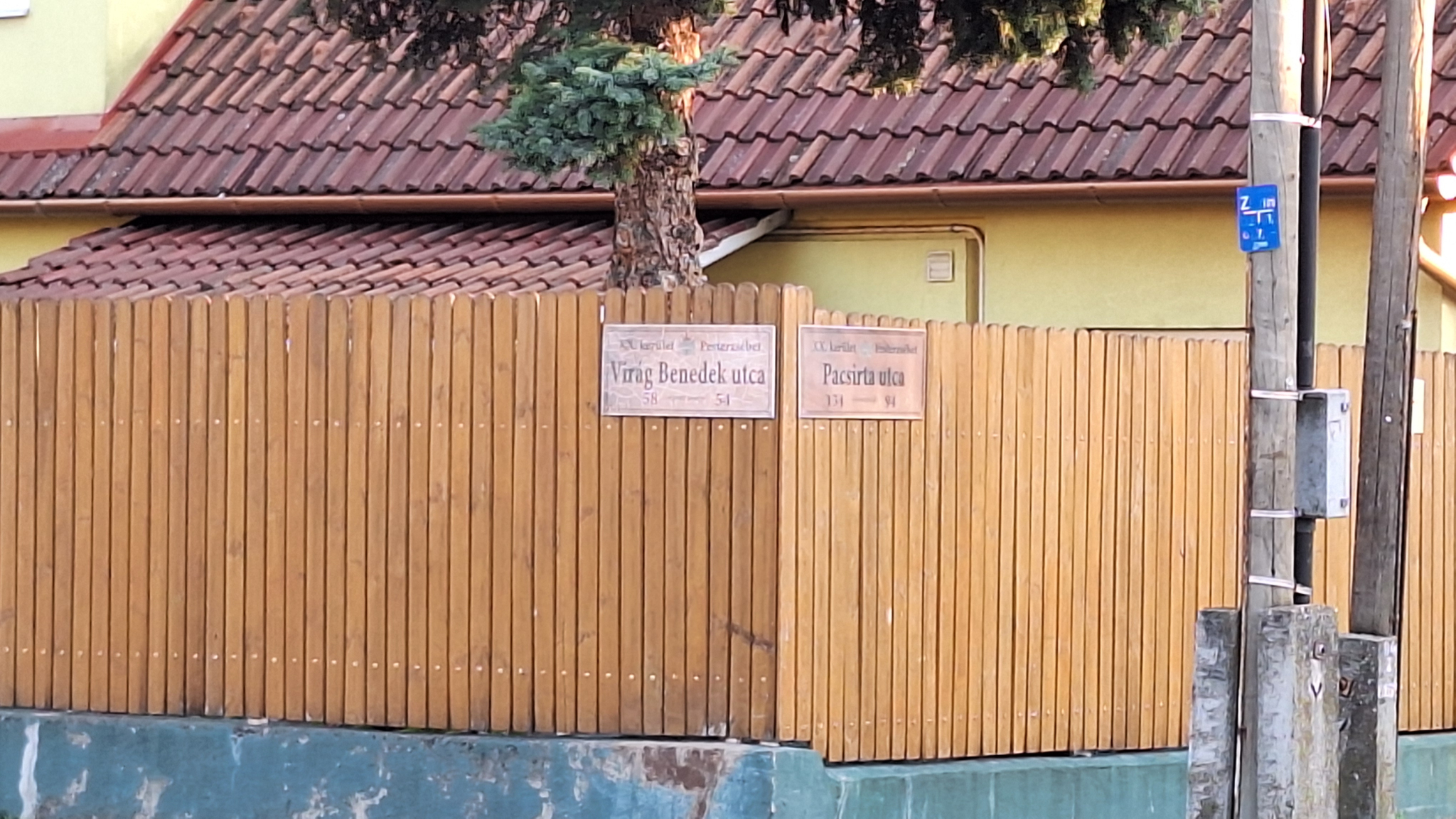 A Virág Benedek és Pacsirta utca sarkán teljesen bebarnult két utcanévtábla.