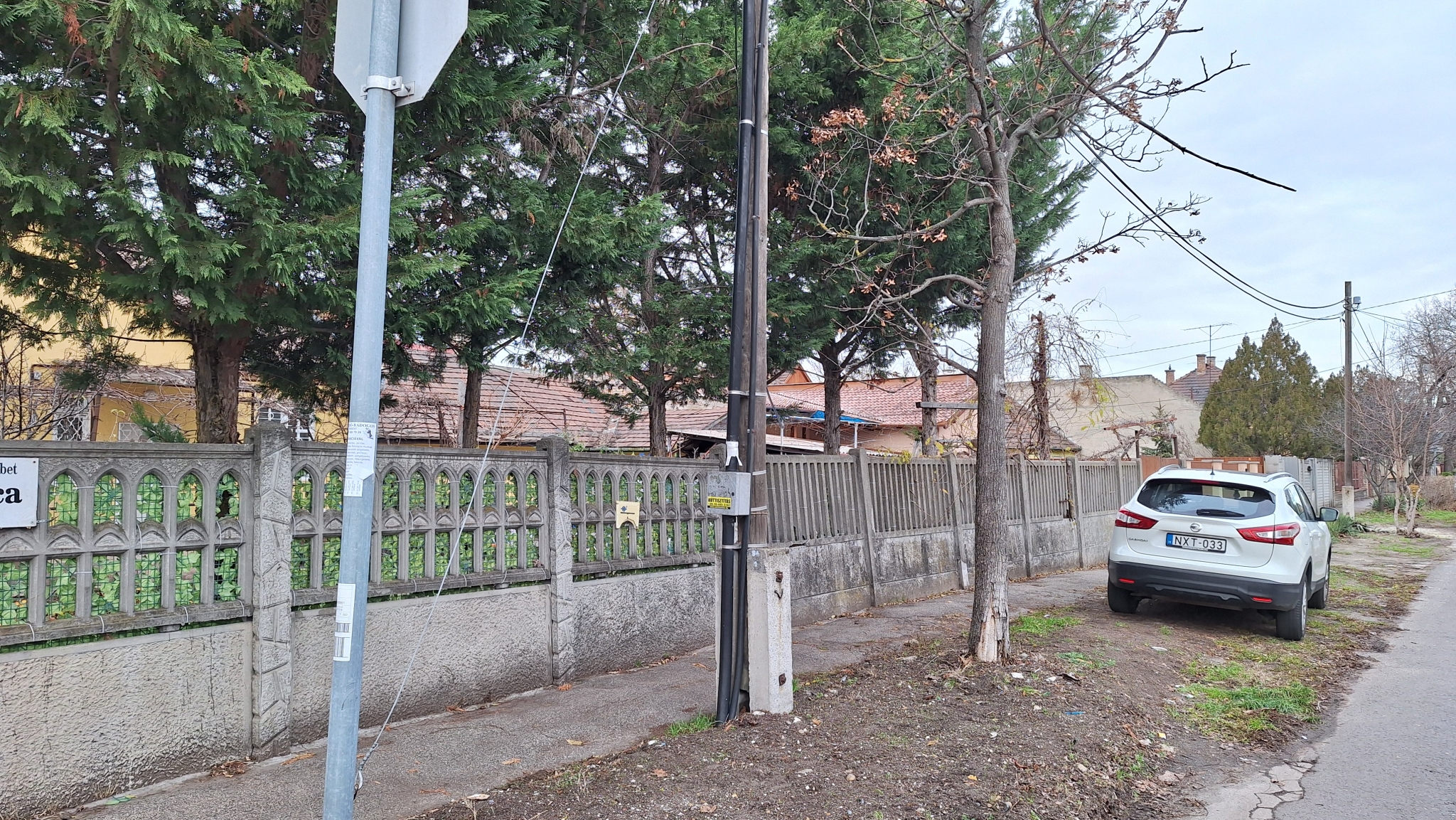 A Virág Benedek és Átlós utca sarkán álló távközlési oszlopról kötegekben lóg a vezeték.