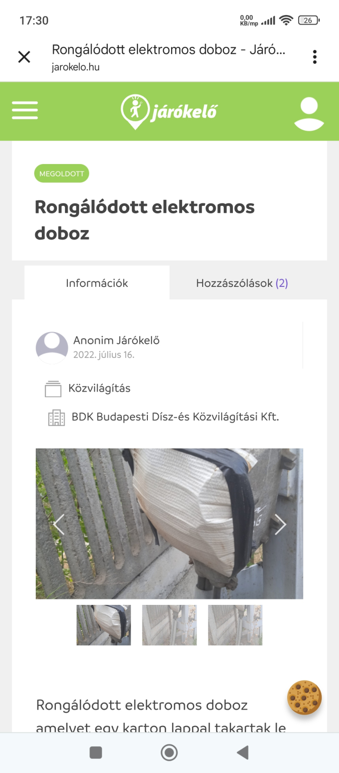 Köszönjük a bejelentését. Tájékoztatjuk, hogy a jelzett címen a hiba kijavításra került.
