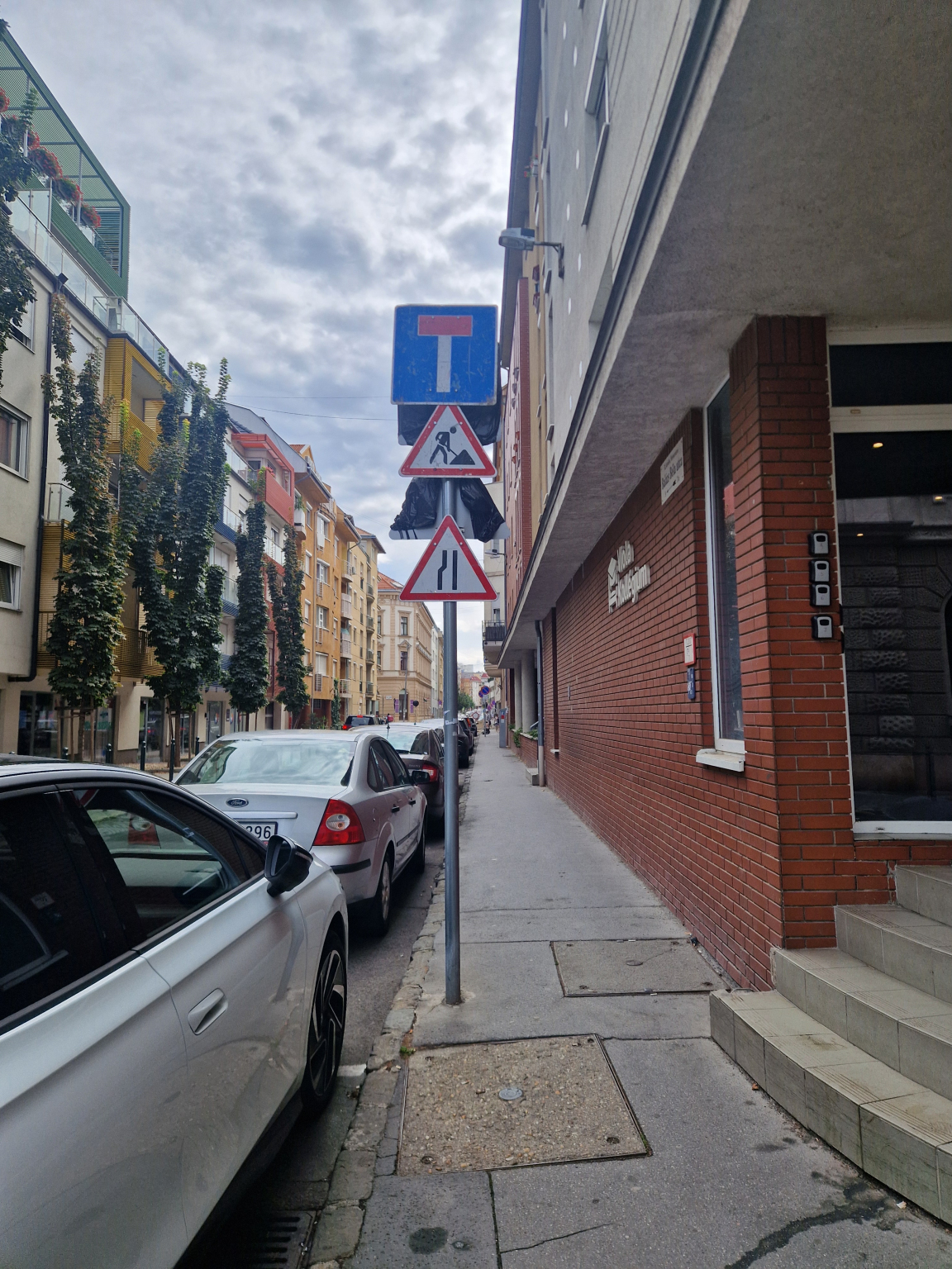 Budapest IX. kerület Balázs-Béla-Thaly Kálmán utca kereszteződés felújítása miatt plusz KRESZ-táblákat helyeztek ki a Viola-Balázs Béla utca sarkára (kollégium elé). A tábla belóg a járda feléig, akadályozza a gyalogos közlekedést, ráadásul pont gyerekfej magasságban van a zsákutca tábla széle/sarka, a kisfiam jól belement az éles szélébe. Kérem, próbálják meg balesetmentesen kihelyezni.