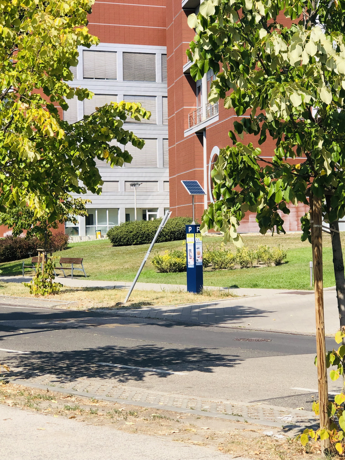 Feltételezhetően az egyetem területén lévő forgalmi tábla ferde.