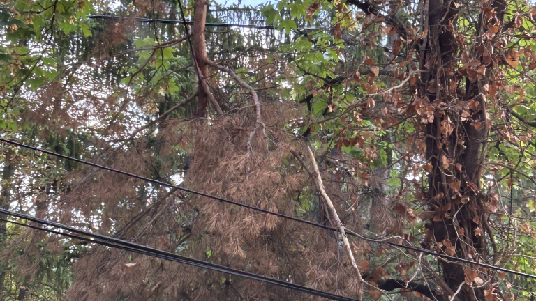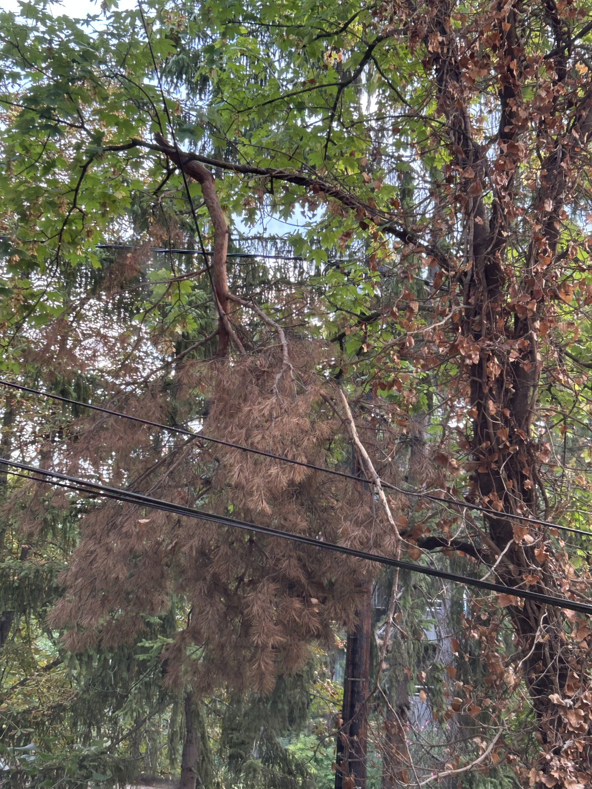 Köszönjük a bejelentést, a kiszáradt fenyőfa, amiről az ág leszakadt a Bartha u. 4/a társasház tulajdonát képezi, de mivel közterületi közlekedést, ill. felsővezetékeket veszélyezt...