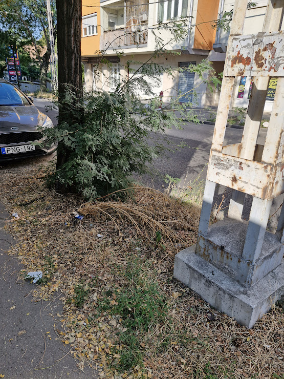 Gondozatlan, szemetes utcarész, zöldhulladékhalmok a Szugló utcában. Kérjük a terület megtisztítását.