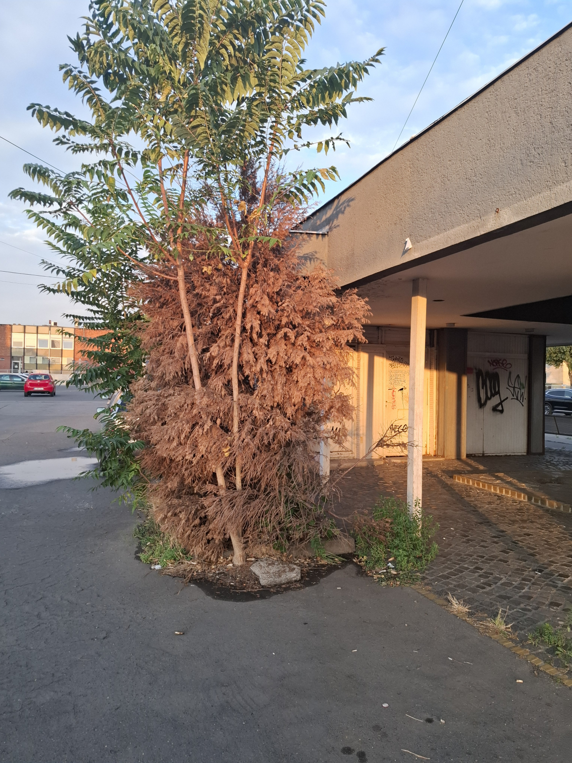 A Kerepesi út és az Ifjúság utca kereszteződésében, a 77 trolibusz megállója melletti épületnél egy örökzöld fa kiszáradt. Kérem távolítsák el, rendezzék a környezetet!