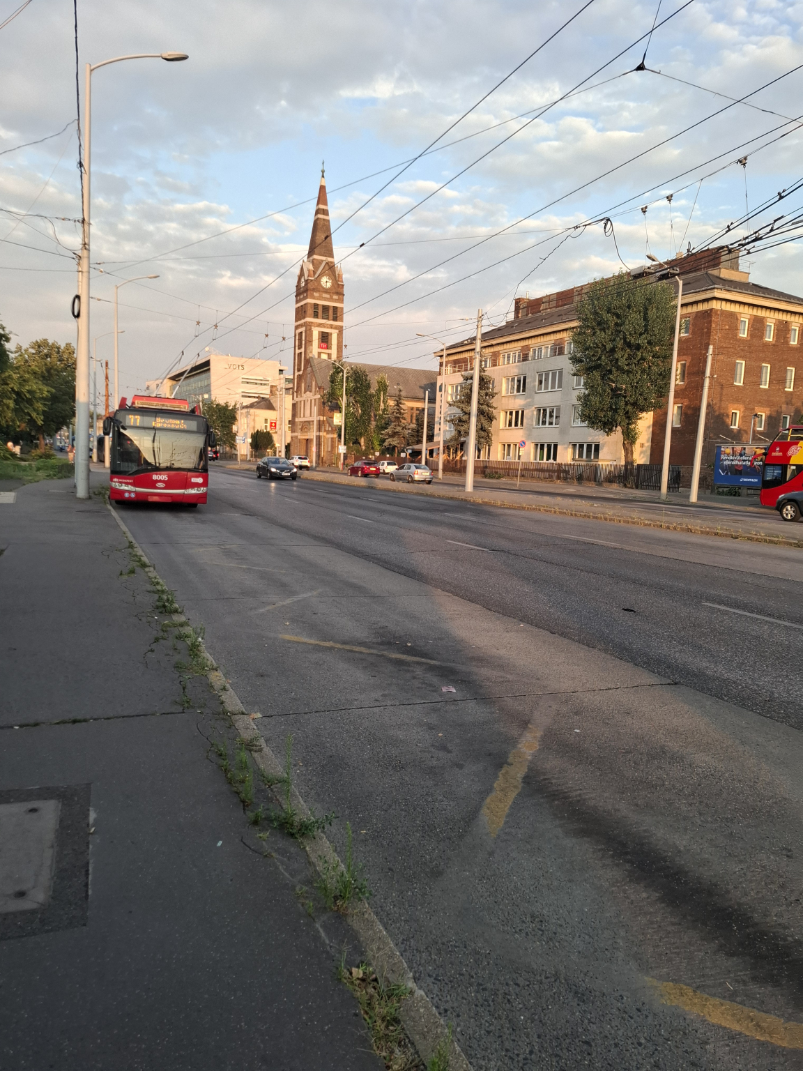 A 77-es trolibusz Puskás Ferenc Stadion végállomásán (az Ifjúság utca végén) a sárga felfestés lekopott az aszfaltról.