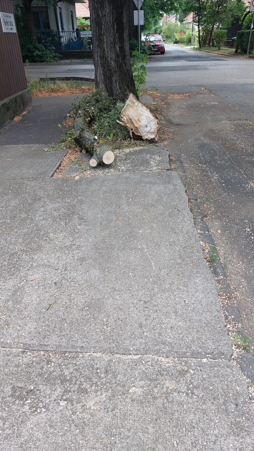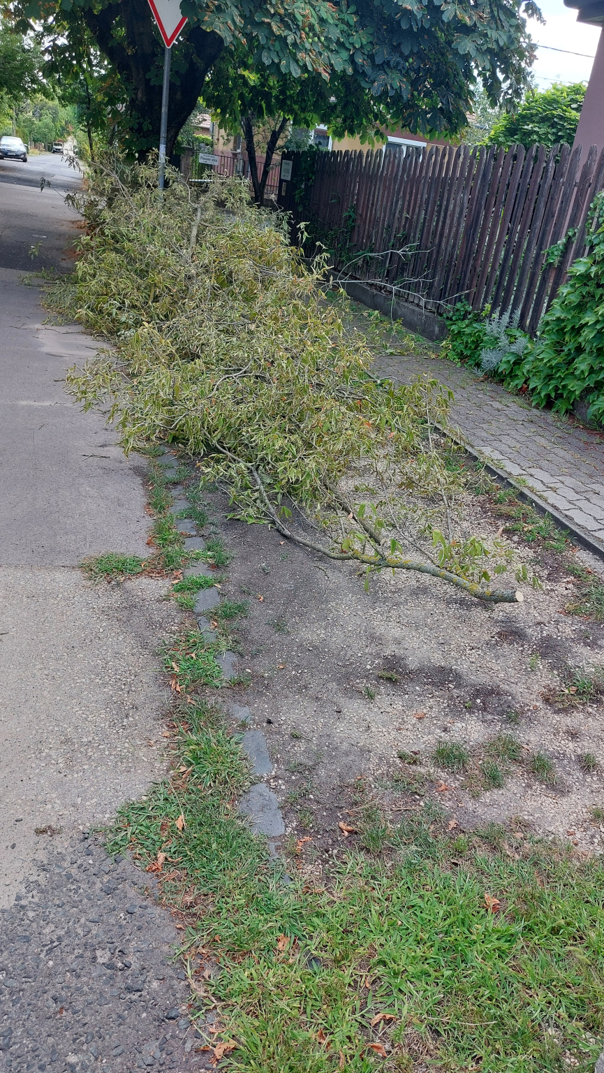 Hatalmas ága egy fának leszakadt, tűzoltók feldarabolták és az út szélén hagyták az ágakat.
