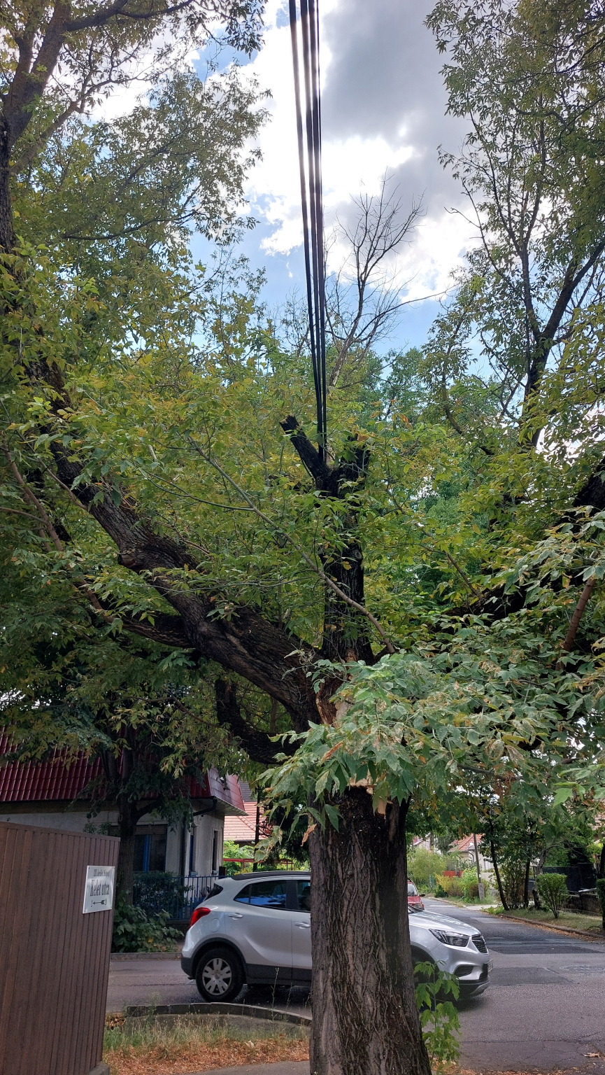 Járda szélén álló fáról rendszeresen leszakadnak nagy ágak. Tűloltók is javasolják, hogy önkormányzat nézettese meg, lehet ki kell vágni. Fa egyik oldalán az utcában óvoda van, másik oldalán forgalmas út. Fa ágai között vezetékek mennek át.