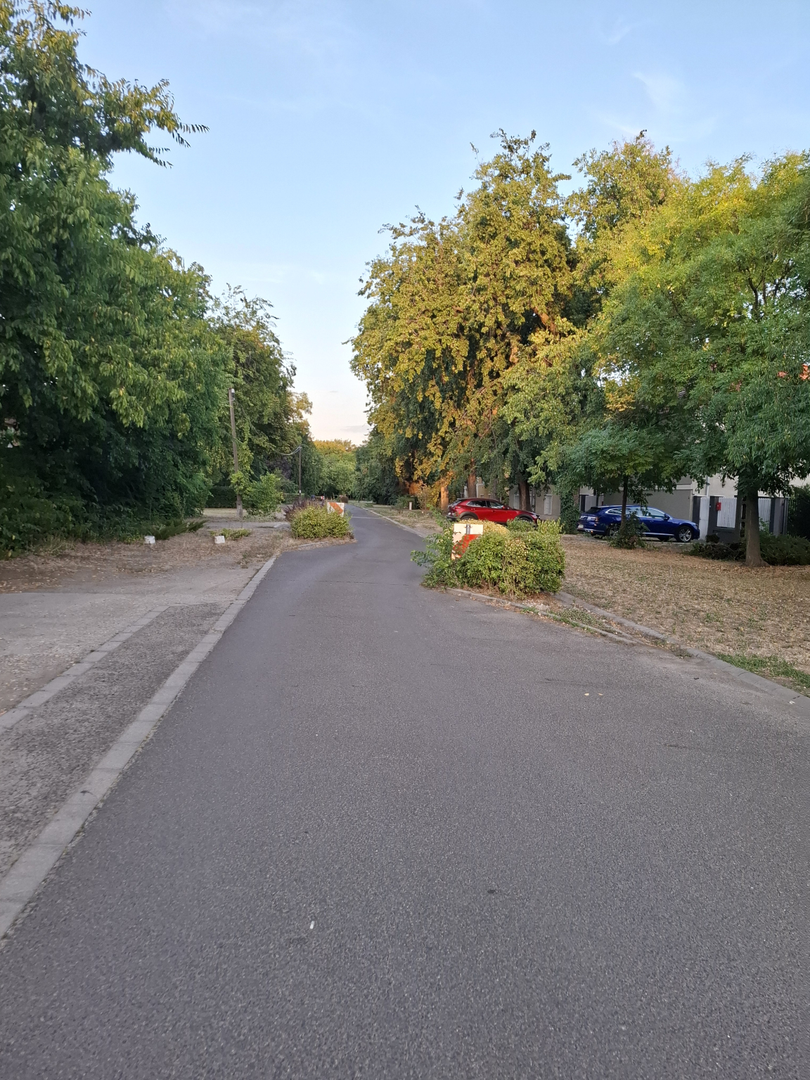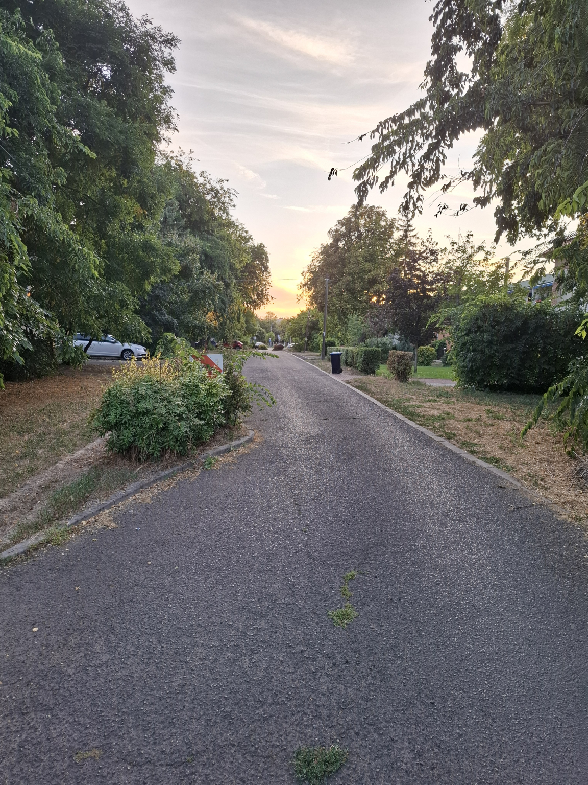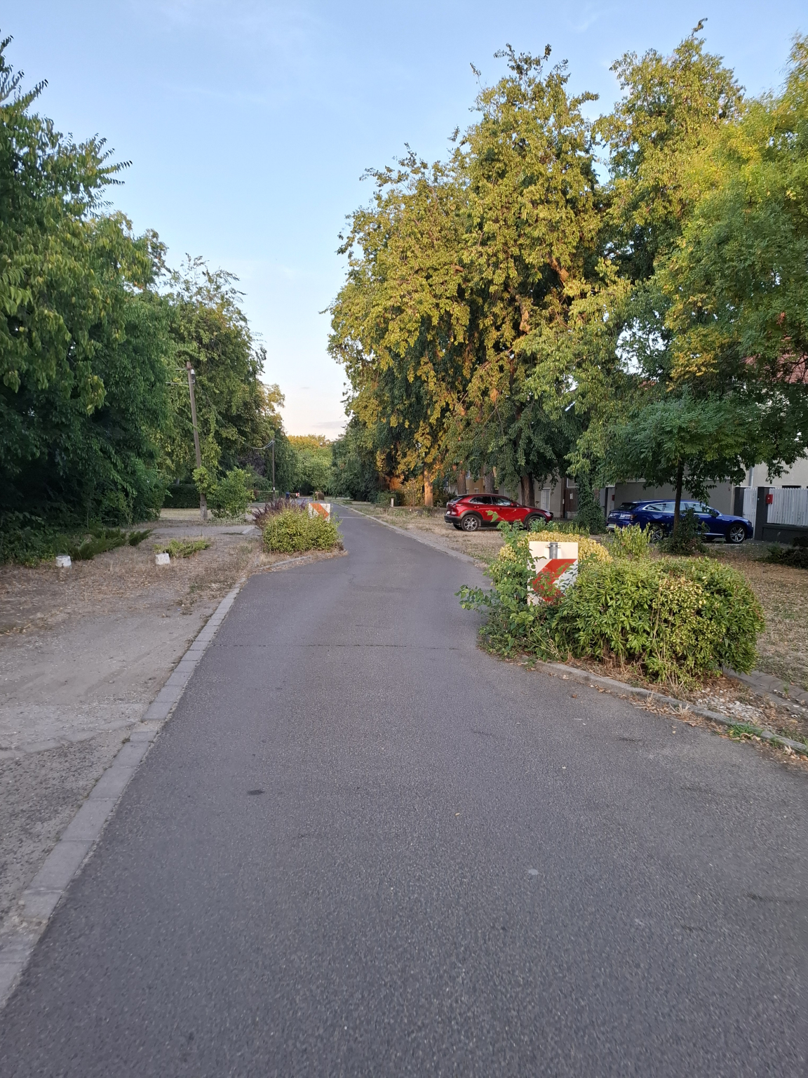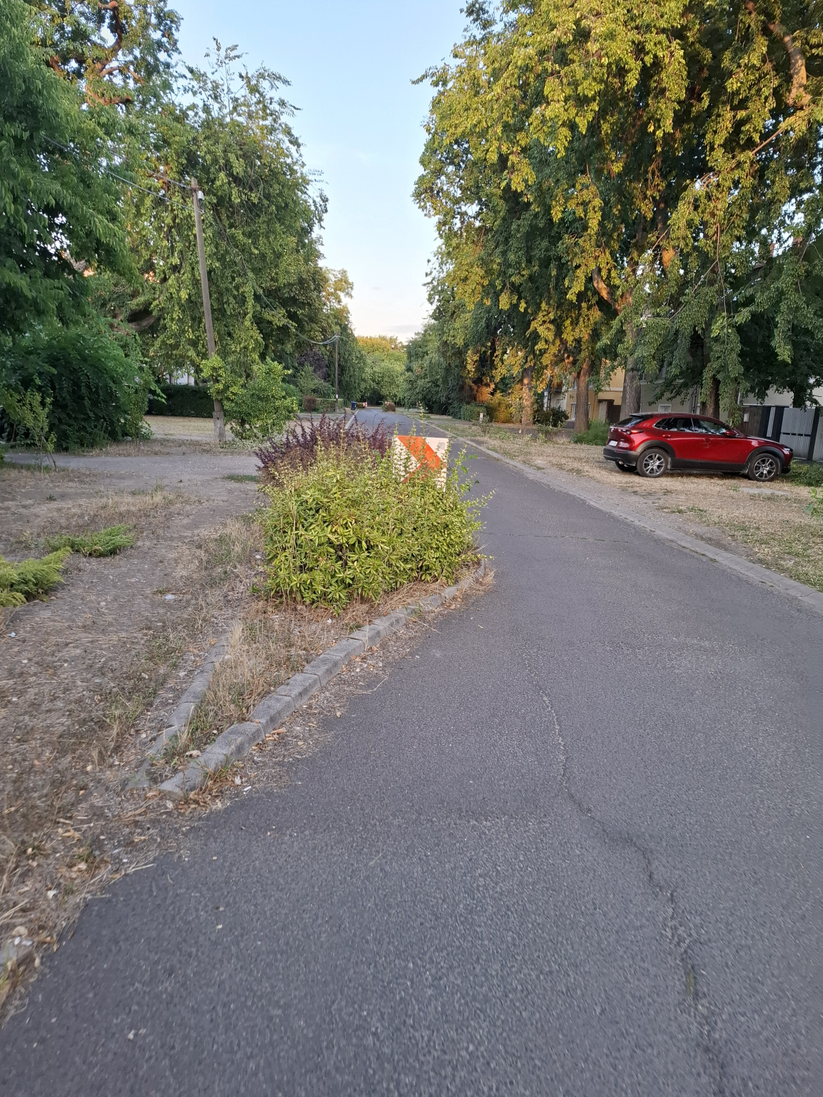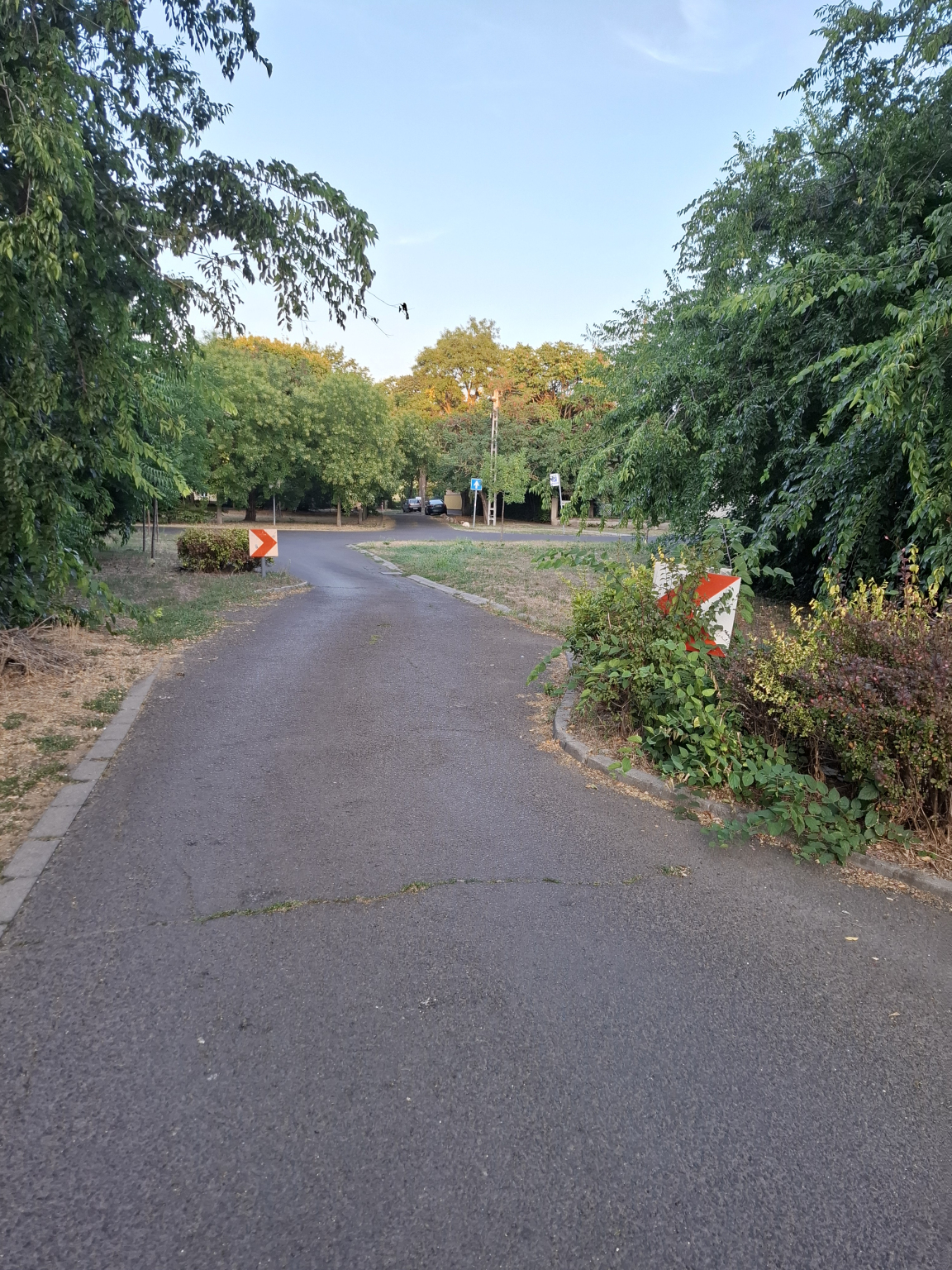 A Róna közben a bokrok is.ét takarják a közlekedési táblákat. Ezeket a forgalomlassító öblöket tábla nélkül nehéz észrevenni szürkületben.